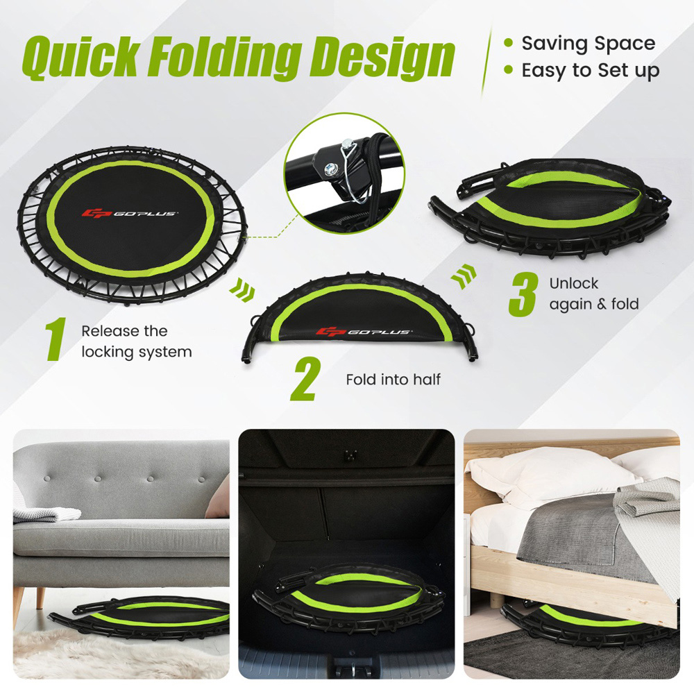 Elevate your child's play area with the Costway Green Mini Trampoline with 2 Resistance Bands 101cm. This foldable mini trampoline has a diameter of 101cm, providing plenty of space for adults and children to exercise and have fun. It's foldable design allows for quick folding, making it easy to store and carry. The trampoline comes with a four-level height adjustable handrail, ranging from 102cm to 126cm, designed for people of different heights. The handrail is covered with thick foam for a comfortable grip. It is equipped with two detachable resistance bands, adding more variety to your workout routine. The trampoline's heavy-duty steel structure and premium PP jump cloth ensure high stability and durability, with a maximum weight capacity of up to 150kg. It's six sturdy foot tubes with non-slip pads and closed design with Oxford fabric provide safety during use. The trampoline is easy and quick to assemble and suitable for indoor and outdoor use, making it perfect for any space, from the living room to the backyard.