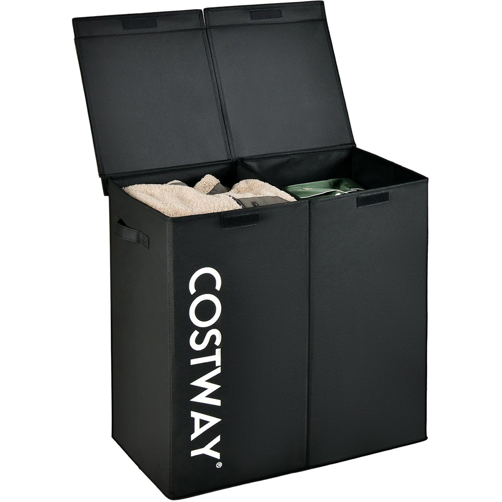 Enhance your home organisation with the Costway 2 Section Black Laundry Hamper 105L, a perfect blend of functionality and style. This spacious hamper offers a generous 105L capacity, ideal for storing a variety of items such as clothes, towels, and bed linens. It features a solid wooden lid that not only maintains a neat appearance by concealing contents but also helps contain any unpleasant odours. The two-section design facilitates easy sorting of different colours and materials, simplifying your laundry routine. Constructed from thickened non-woven fabric and reinforced with a wooden board, this hamper promises durability and robustness for long-lasting use. Additionally, equipped with side handles, it ensures effortless transportation around your home, making it an excellent choice for the laundry room, bathroom, or bedroom.