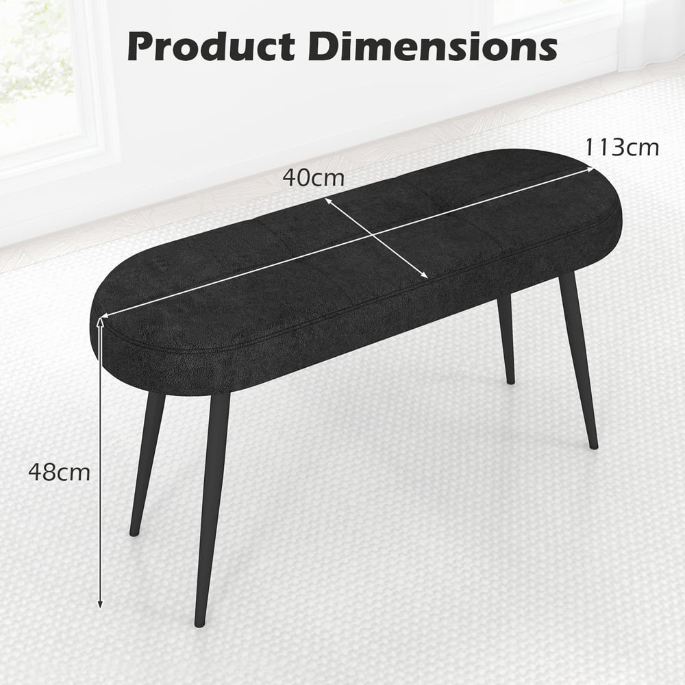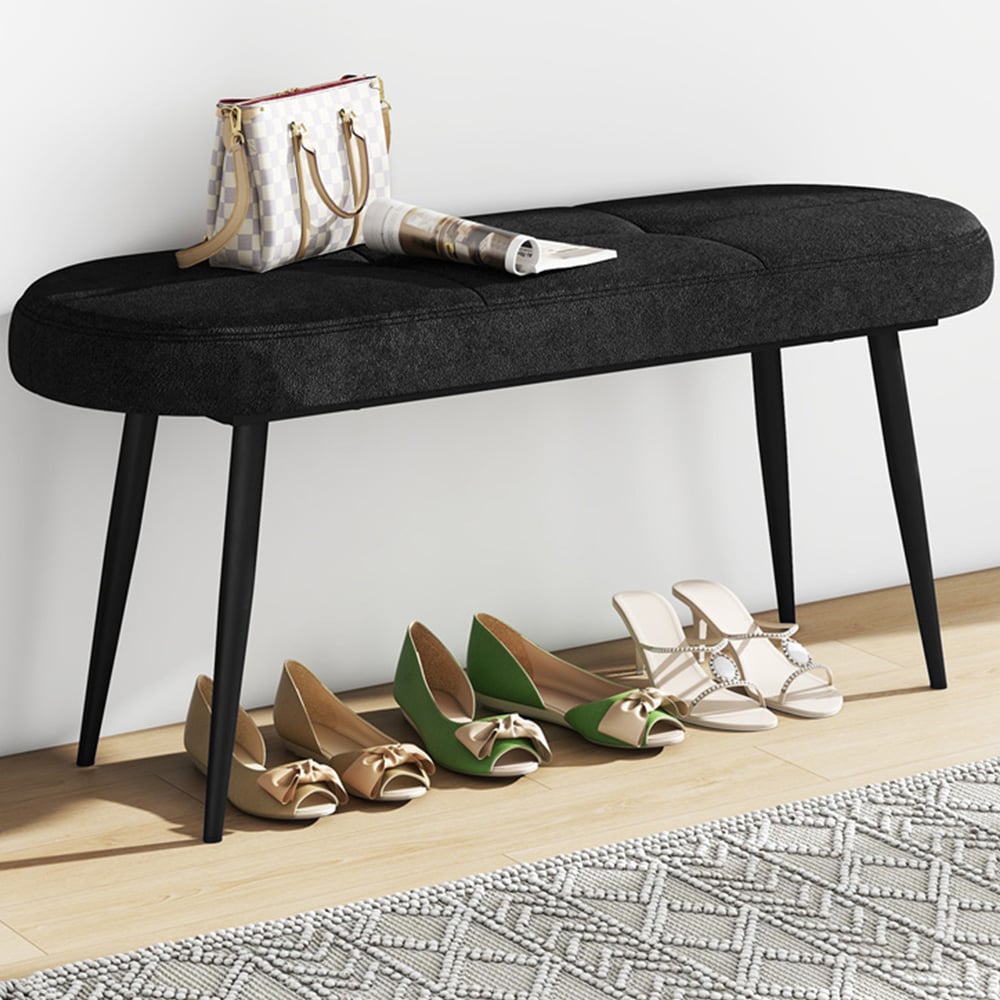 Enhance your home's functionality and style with the Costway Black Padded Ottoman Bench. Ideal for seating two people, this bench features a premium polyester fabric cover and a bouncy sponge filling, ensuring a comfortable experience whether you're sitting down to change shoes or simply relaxing. The rustproof metal legs support a substantial weight capacity of 300kg, making it a sturdy choice for any space. Non-slip foot pads prevent floor scratches, making it suitable for placement in entryways, living rooms, or bedrooms. Its simple assembly process ensures that you'll have this stylish addition ready in no time.