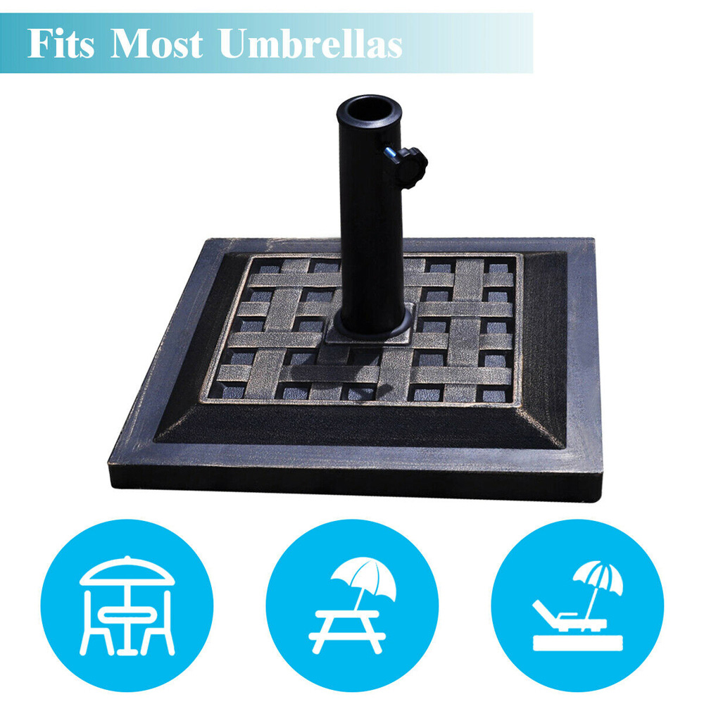 Hot summer is coming, do not be tanned or burned by strong ultraviolet rays. This patio market umbrella base is great for your backyard, patio, deck, or patio table even at an outdoor occasion. You could enjoy outdoor lifestyle with this attractive outdoor umbrella base, which provides artistic, innovative, fashion-conscious and high-quality products for all your needs. It is also constructed from durable resin material to resist wear and tear, so this unique base will be with you all the way. The tightening knob at the base helps you quickly adjust it to fit umbrella pole so you can enjoy your umbrella with no worry. You could add a set of sand bags to keep it from blowing over when the umbrella is up and the wind is blowing. Meanwhile, it is weight about 11.7kg and easy for you to carry it outside. Adjustable Screw Mechanism: The pole of this patio umbrella stand is adjustable in diameter from f38mm – 48mm, which will bring convenience for you to choose from ideal umbrella and install it on the base. And plenty of umbrellas with various sizes can match our base. Meanwhile, you could tighten the screw to ensure the stable use. Classic Square Base: The patio umbrella base in the shape of 44cm square decorated with stripes pattern, enjoying an antique finish and will never be out of style. You may use it in the private garden, lakeside, beach and pool. What’s more, the square shape space saving design could help you place and store it. High Quality and Durable Material: The bottom part is made of rust free resin with concise decorative pattern, effectively preventing chipping, peeling, rust and corrosion. And the pole part is made by steel tube which could supply more stable to fix the umbrella. Further, it will last through any weather and allow you enjoy the happiness time under the umbrella. Lightweight for Easy Transport: This outdoor umbrella holder is weight about 11.7kg and easy for you to carry it outside. Whether used for private garden, or company with you in beach, our umbrella base will always be your first choice for its easy holding capability. And it is also convenient to place on your car when going outside. Suit for Outdoor Use: The umbrella base can be used on plenty of occasions, and pretty practical and essential to sun umbrella. High density resin base is good at keeping shape, not easy to be chipped off or broken. And it could be easy cleaned by simple rinsing after using in beach and other wet environment.