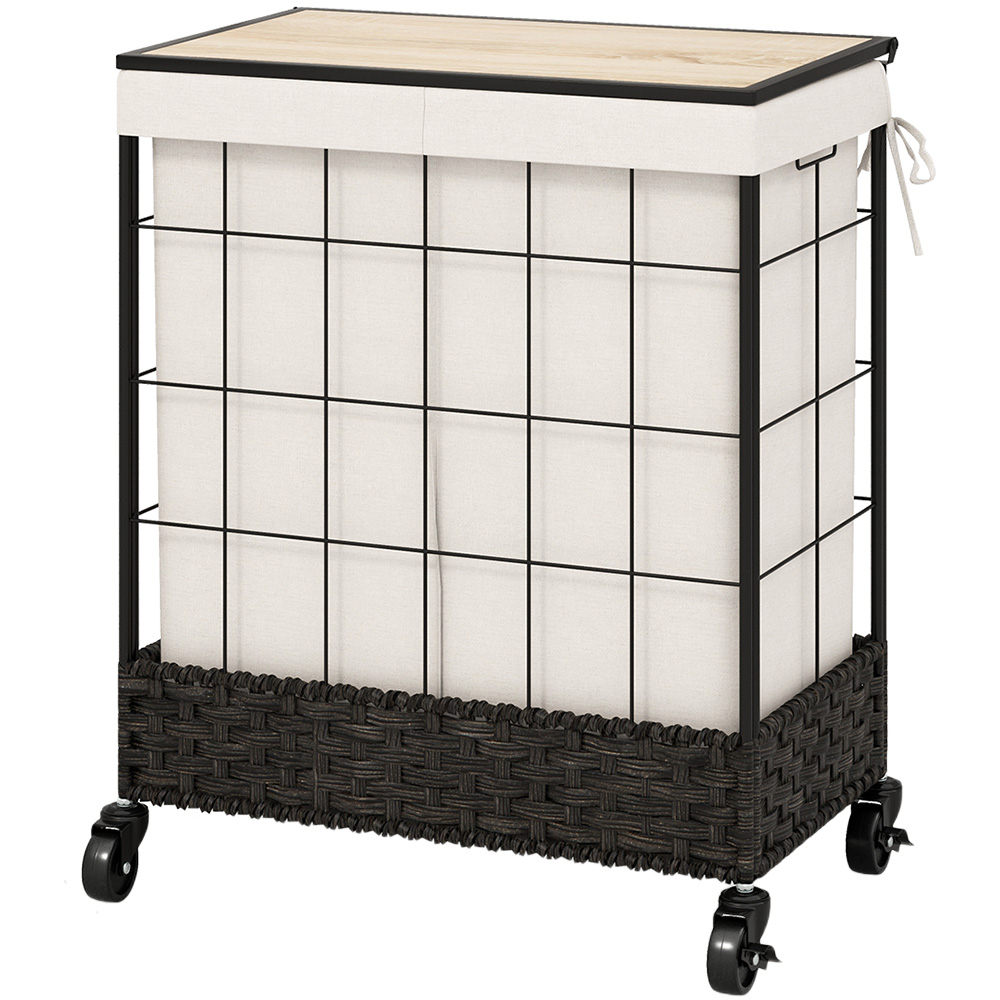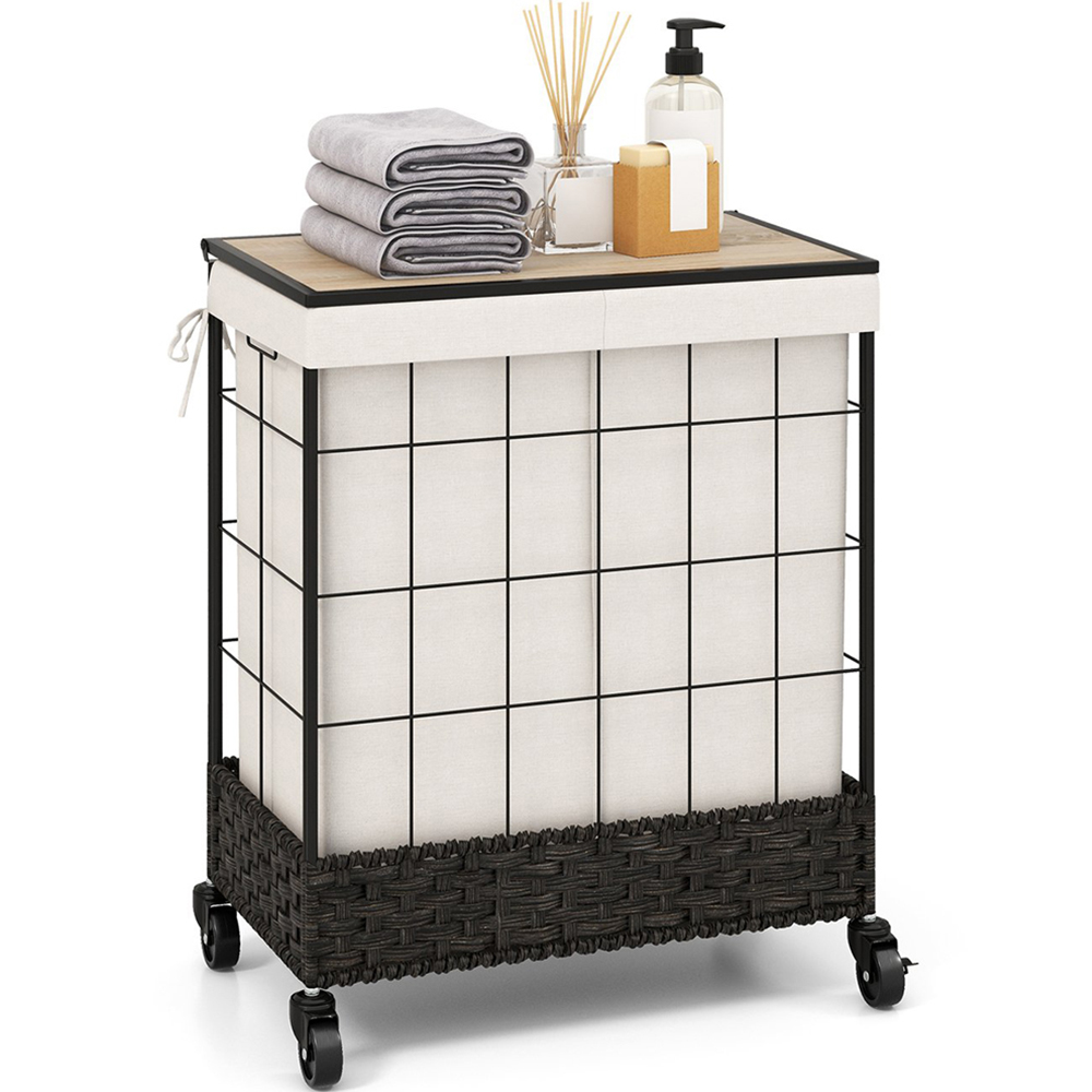 Experience the ease of laundry day with the Costway Black Handwoven Rattan Laundry Hamper 130L. It is designed to make your chores a breeze with its lockable wheels and dual-section design. This chic, black rattan hamper not only adds a touch of elegance to your home but also offers unmatched functionality. Its high mobility wheels allow for smooth transportation of heavy loads across various surfaces, and the lock feature ensures stability when stationary. The powder-coated metal frame coupled with water-resistant PP rattan weaving guarantees durability and long-term use. Additionally, the separate compartments facilitate efficient sorting of light and dark clothes, while the MDF lid protects your laundry from dust and provides a handy surface for placing cleaning supplies.