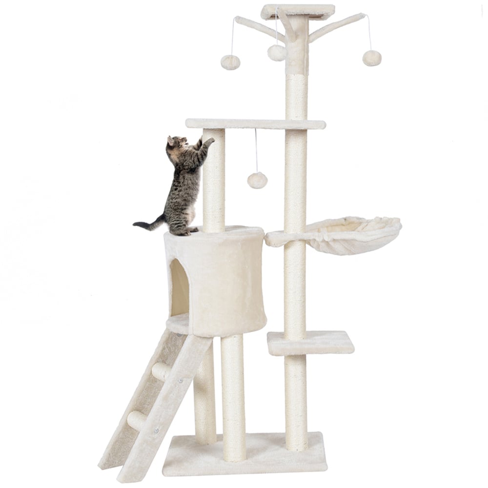 Give your pet a comfortable place to relax with the Costway Beige Cat Tree Tower with Scratching Sisal Post. This 6-layer cat tree offers your feline friend a fun and cosy space to climb, scratch and rest. Covered in plush fabric, the platforms provide comfort, while the seven sisal scratching posts keep claws healthy and protect furniture. It also includes a multi-functional ladder for scratching and climbing. The wide base ensures stability and playful pompom toys add excitement.
