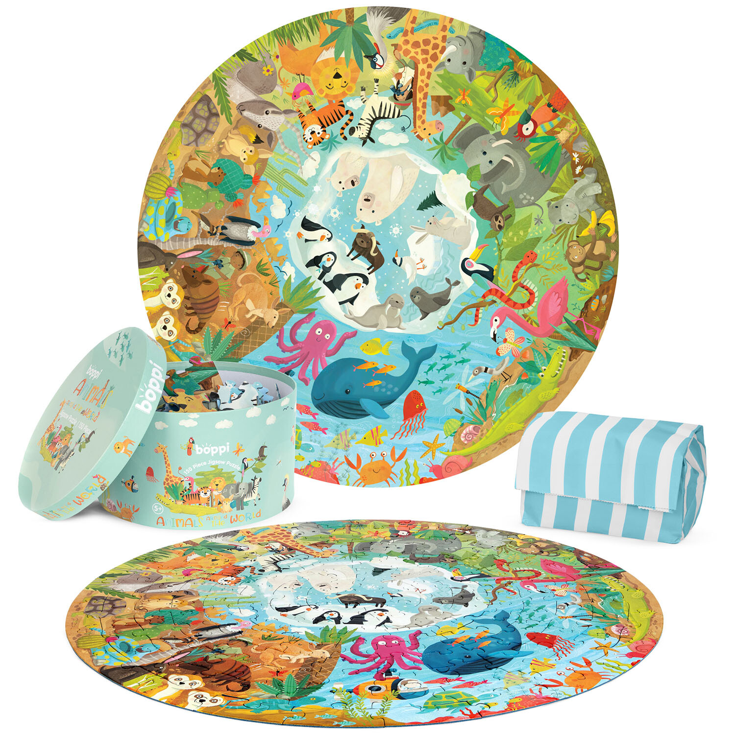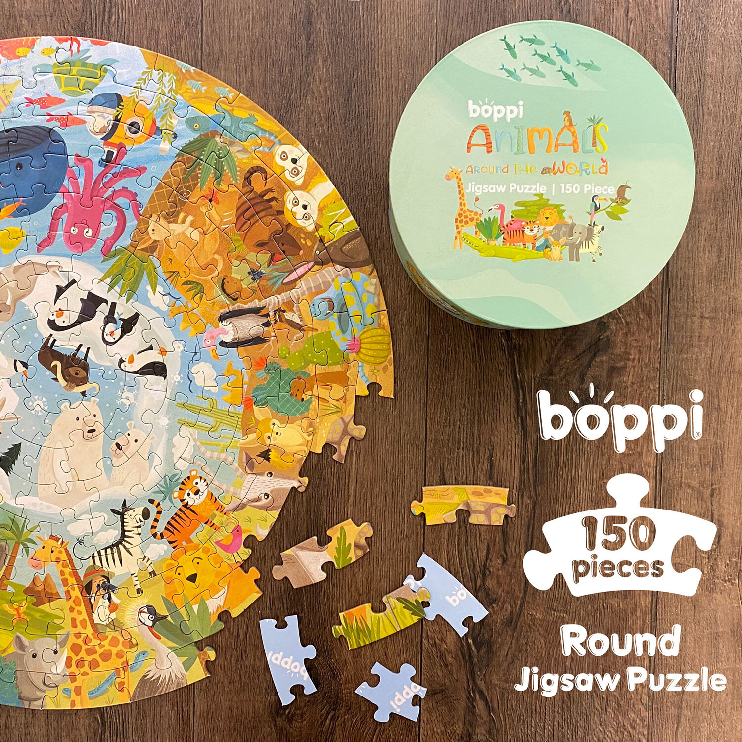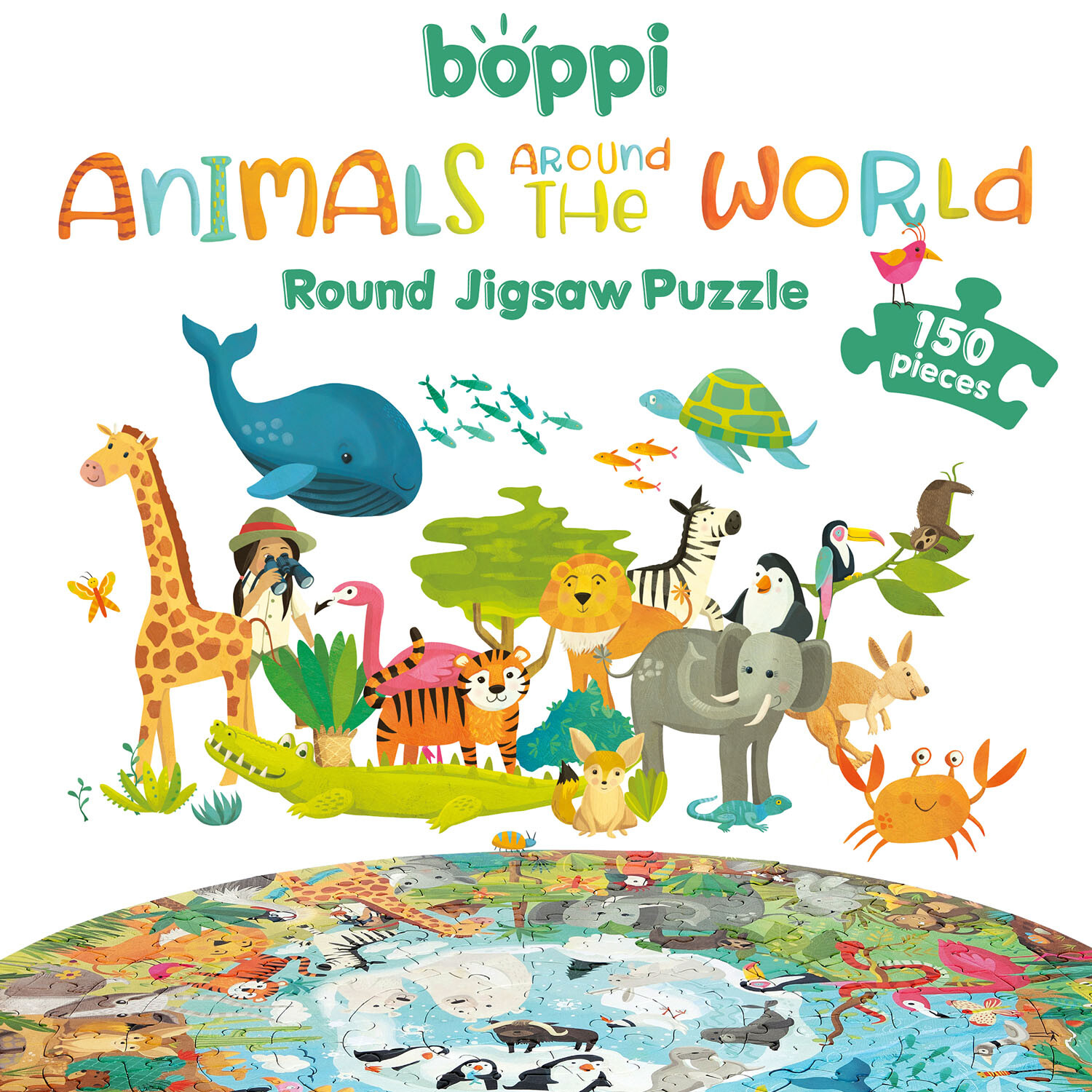 Discover the wonders of the animal kingdom with the 150 Piece Boppi Animals World Jigsaw Puzzle Map. This beautifully illustrated puzzle delivers an engaging and educational experience. The three-layered pieces feature a fine linen-structured surface and a smooth backing, perfect for little hands. Measuring 58cm in diameter once completed, the puzzle comes with a 30cm fold-out image sheet for easy assembly.