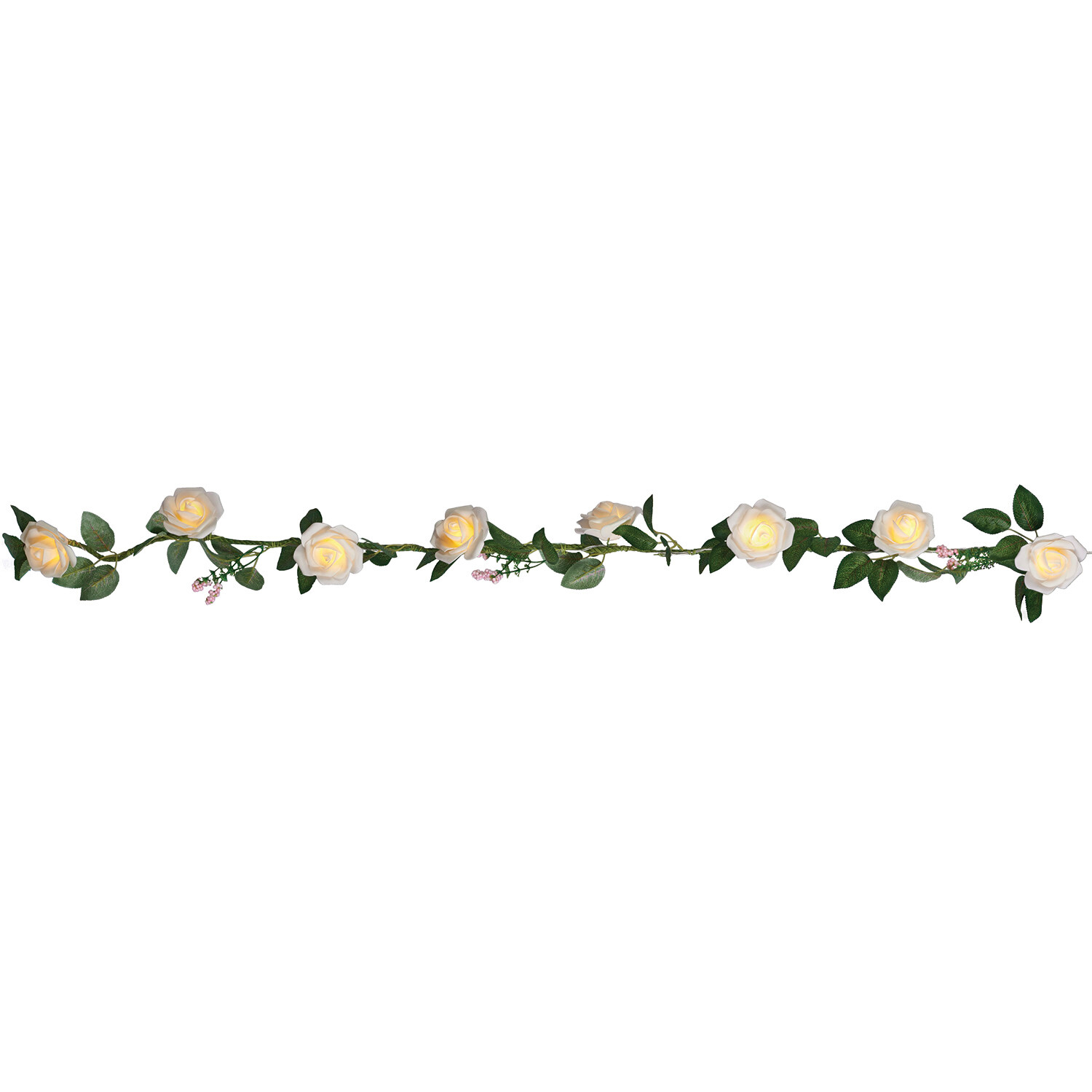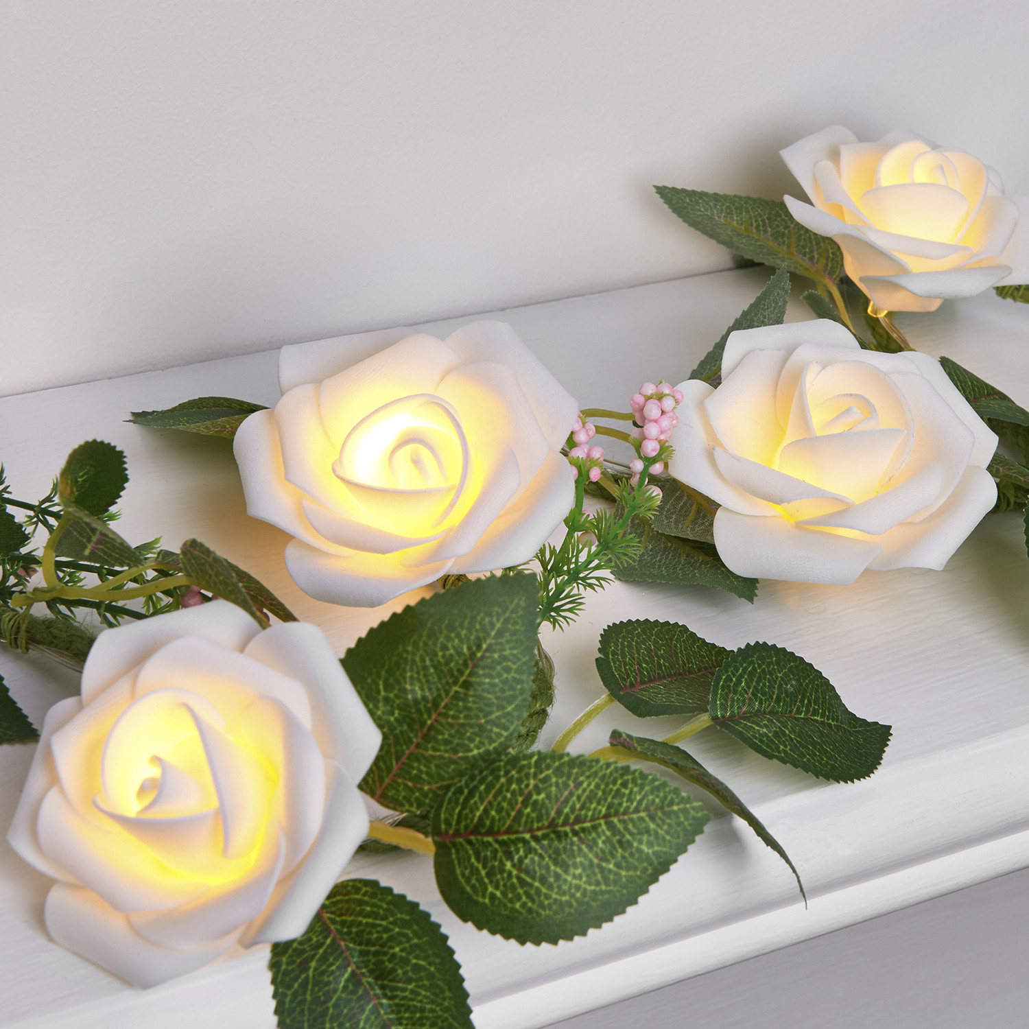 This 16LED White Rose Garland String Light is the perfect decorative lighting piece for a variety of themes, from country chic to romantic fairytale. A gorgeous display of elegant white roses and luscious green leaves, this garland is entwined with sixteen warm white LEDs and it easy to hang or place anywhere thanks to its battery-operated design.