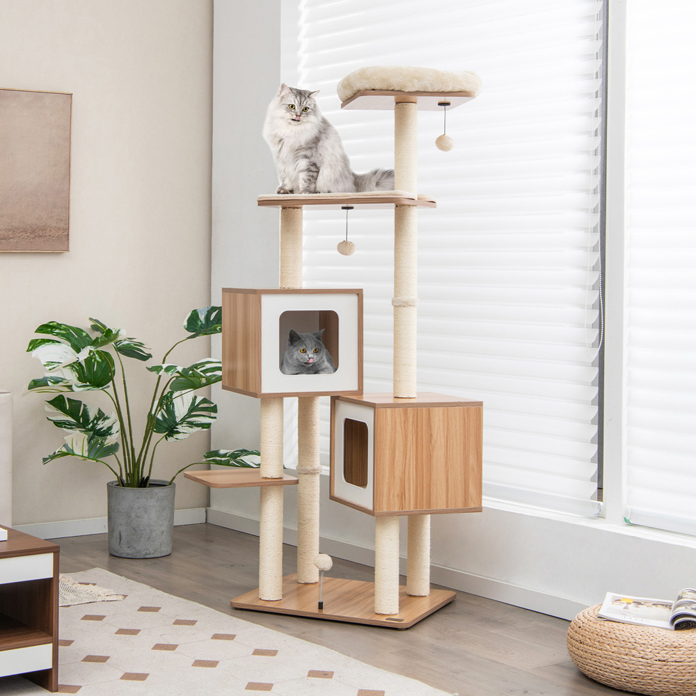 Make a classy addition to your home decor with the Costway Natural Wooden Cat Tree Tower with Sisal Scratching Posts. It is crafted using 15mm thick MDF boards for durability and longevity with a load-bearing capacity of up to 15kg. This six-layer cat activity centre features two luxurious condos with soft cushions, a cosy top perch and a comfortable jumping platform for the cats to play, rest and explore during their little indoor adventure. The two amusing dangling furballs and an extra spring ball consume energy when you do not have time to play with your lovely kitten. This kitten tower is designed with fully covered natural sisal scratching posts which allow kittens to grind claws and also protect your furniture from destruction. The cat tree includes ultra-soft and pet-friendly plush cushions, providing a warm spot for your sweet pet to snap in. The top perch allows your cat to enjoy the beautiful outdoor scenery while sunbathing. The cushions can be detached and washed to keep them clean and hygienic. Each condo is supported by two thick posts ensuring good stability. It includes clear illustrations, and all parts numbered for quick and easy installation.