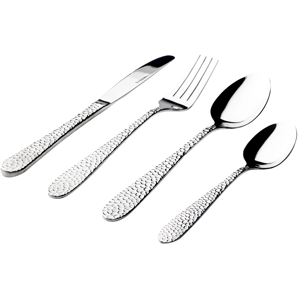 Dine in style with your family with this Sabichi 16 Piece Hammered Cutlery Set. Designed with a unique textured handle, this cutlery set adds a touch of sophistication to any table. Made from durable stainless steel, the hammered finish not only enhances the aesthetic but also provides a comfortable grip. The set includes four knives, four forks, four tablespoons, and four teaspoons, making it perfect for family dinners or entertaining guests. Dishwasher-safe for convenient cleaning, this set is a perfect blend of style and practicality.