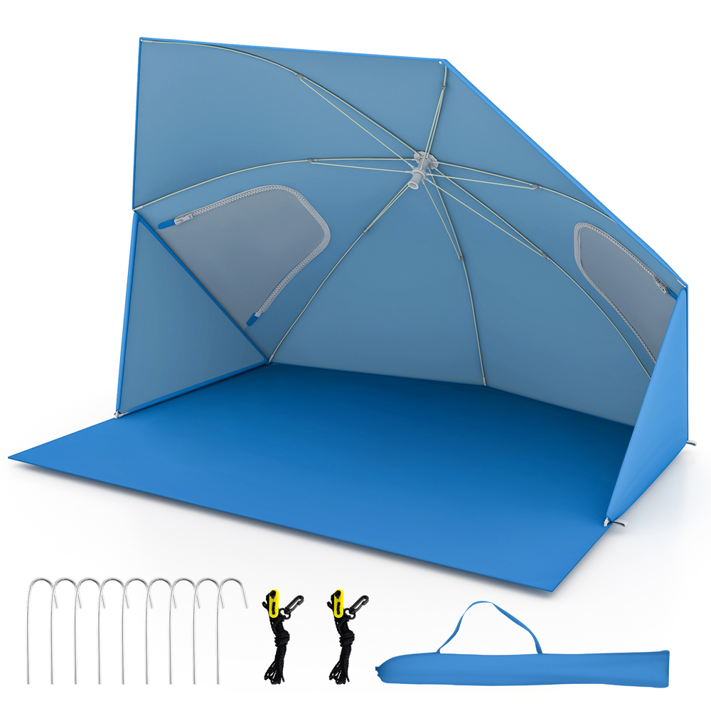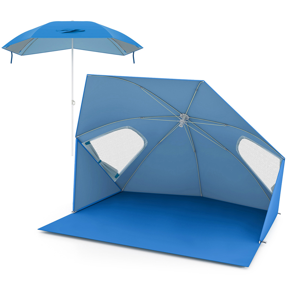 For family beach days, the convertible beach tent conveniently shifts into a sun umbrella, accommodating 2-4 people. Crafted with UPF 50+ silver-coated polyester for perfect outdoor protection, it also offers water resistance and durability. It boasts 2 roll-up mesh windows, which provide optimal ventilation, extra coverage from side flaps and a removable groundsheet. Stability is enhanced by 7 strong ribs and an aluminium pole, along with included wind ropes and metal ground stakes. Setting up the beach shade shelter is trouble-free, and it comes with a carry bag, making it ideal for camping, picnics, fishing, and various outdoor activities. Convertible Structure: Discover ultimate convenience with the 2-in-1 beach tent that effortlessly transforms into a sun umbrella, perfect for every sunny outing. Designed to comfortably accommodate 2-4 people, it’s an ideal choice for family beach days. UPF 50+ Protection: The beach shade canopy is crafted from silver-coated polyester fabric that not only provides UPF 50+ protection, shielding you from over 98% of harmful UV rays, but also boasts excellent water resistance and durability. Considerate Details: For optimal comfort, the sports tent features dual roll-up mesh windows with zippers, allowing for great airflow on hot days. In addition, the tent has dual side flaps for extra coverage and a removable groundsheet to keep it clean. Promoted Stability: Thanks to 7 strong ribs and an aluminium pole, the beach canopy provides perfect stability. Besides, you can further secure the beach tent firmly with included wind ropes and metal ground stakes. Easy Setup and Portability: Embrace the outdoors with ease using the convertible beach tent, designed for hassle-free setup and effortless portability. This lightweight tent comes with a carry bag and is perfect for camping, picnics, fishing, etc.