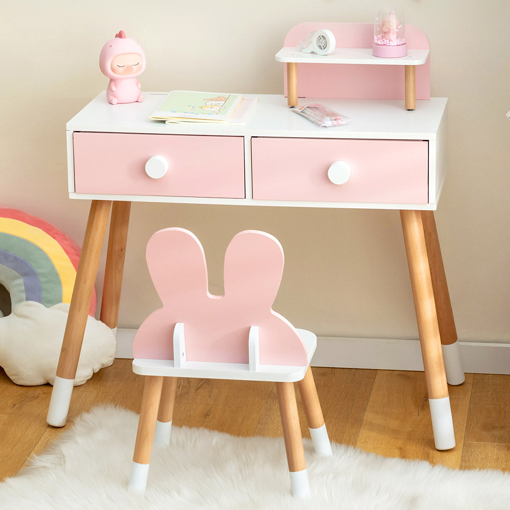 Brighten your little one's room with the adorable Costway Kids Pink Princess Vanity Table and Chair Set. It is designed to spark joy and inspire creativity. This charming set, shaped like a cute rabbit, not only serves as a magical spot for dress-up but also doubles as a practical writing desk. Featuring a shatterproof acrylic mirror for safe self-admiration, the vanity offers ample storage with two pull-out drawers and a small shelf, perfect for stashing jewellery, cosmetics, and other treasures. Built with premium MDF and solid wood legs, this set promises durability and stability, making it a delightful and lasting addition to your child's space.
