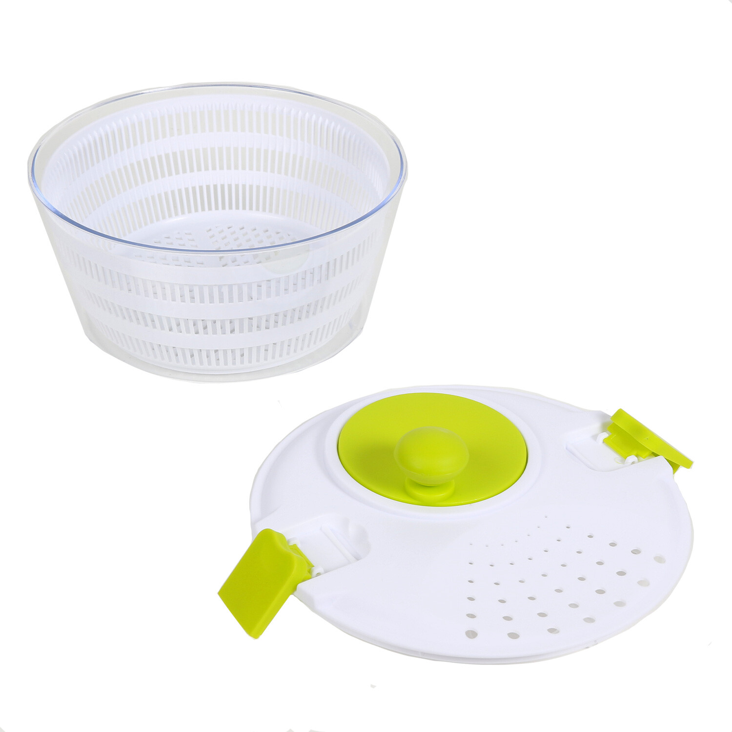 The 2-in-1 Salad Spinner can be used as a washing bowl and a drainer to dry the leaves. It features an outer bowl with a removable internal basket and a lockable lid which fits around the outer bowl for secure use. The rotation mechanism is easy to use and spins the internal basket to help remove excess moisture. With a large capacity, it's ideal for salad leaves, vegetables, and fruits.