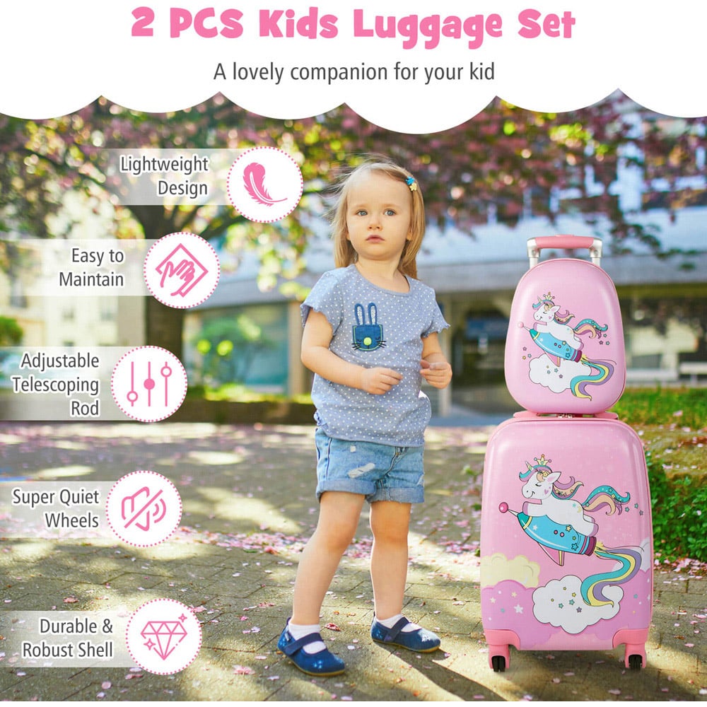 Embark on delightful travels with the Costway Set of 2 Kids Pink Luggage Set with Spinner Wheels, featuring charming unicorn graphics that make any journey a magical adventure. Designed specifically for children, this set includes a suitcase and a matching backpack, both outfitted with practical storage solutions like compartments and pockets to teach kids the essentials of organizing. The telescopic handle and adjustable shoulder straps cater to various heights and body shapes, ensuring comfort for all children. Moreover, the durable ABS material with a PC film coating ensures the luggage withstands the rigours of travel while remaining lightweight and portable, perfect for kids aged three to ten years.