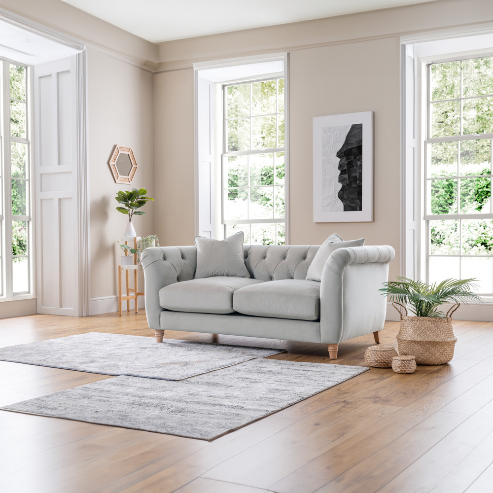Transform living space decor with this 2 Seater Chalk Velvet Sofa. It features fully reversible seat cushions with a pocket spring interior core topped with feathers and fibre for comfort. This sofa is covered in soft-touch, crush resistant velvet to add a touch of charm to your space. It also flaunts deep hand buttoning for style, while the soft padded arms provide added comfort. With this plump and sumptuous sofa, elevate your home's decor effortlessly.