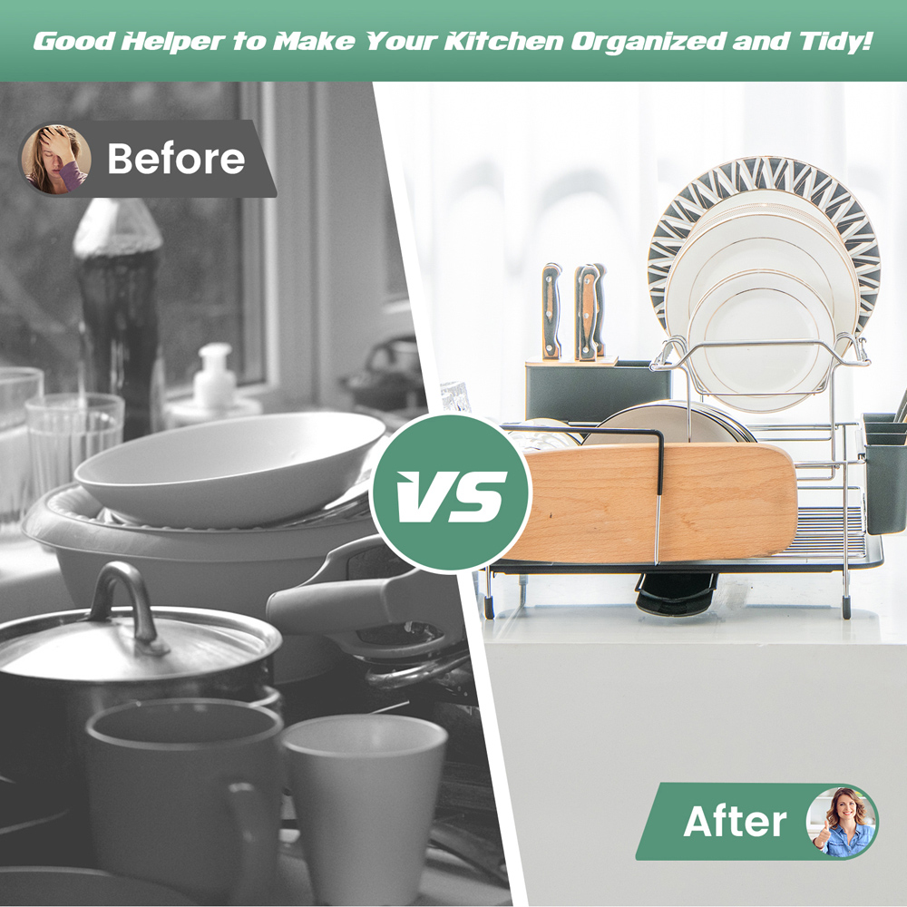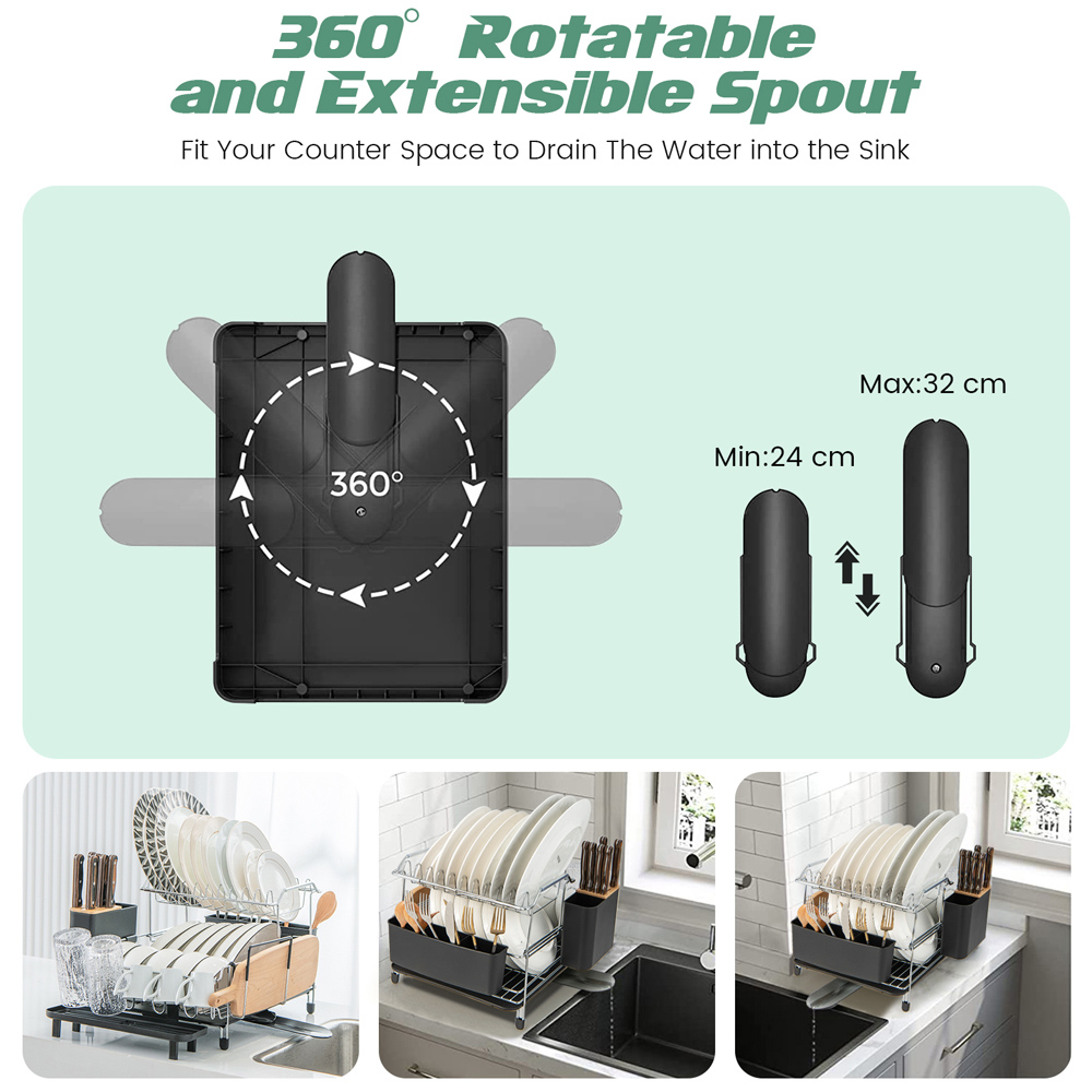 Maximize kitchen efficiency with the Costway Silver 2 Tier Detachable Dish Drying Rack with Drainboard. This versatile dish rack boasts a 6-in-1 multifunctional area, spacious enough to accommodate a variety of kitchenware and tableware such as plates, bowls, and cutlery. Its top tier can be conveniently removed and used separately in the sink, enhancing its functionality. The innovative auto-draining system ensures water flows directly into the sink via a 360° swivel spout, preventing water accumulation and promoting a cleaner kitchen environment. Additionally, its rustproof construction and stable, non-slip design ensure durability and secure placement on any countertop.