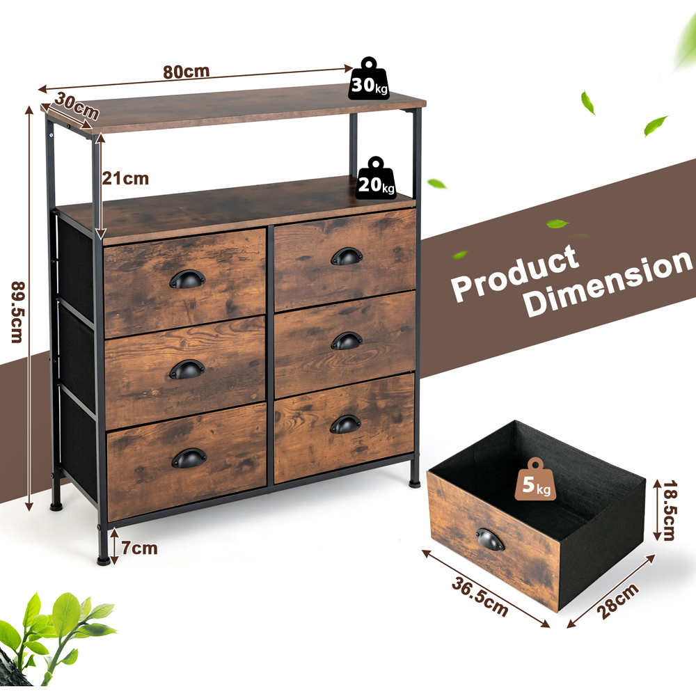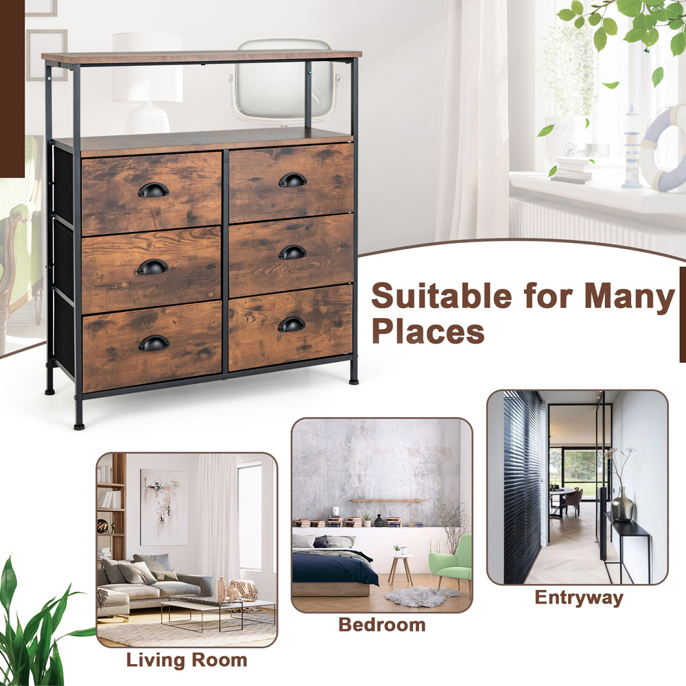 Elevate your home's functionality and style with the Costway 6 Drawer Single Shelf Rustic Brown Storage Unit. This versatile unit not only offers ample storage with its six foldable drawers and double display shelves but also enhances your space with its appealing rustic design. Ideal for various rooms, from the bedroom to the entryway, this dresser combines practicality with aesthetics. The waterproof surface of the display shelves and the sturdy anti-rust steel frame ensure durability and easy maintenance, making it a smart choice for any home.