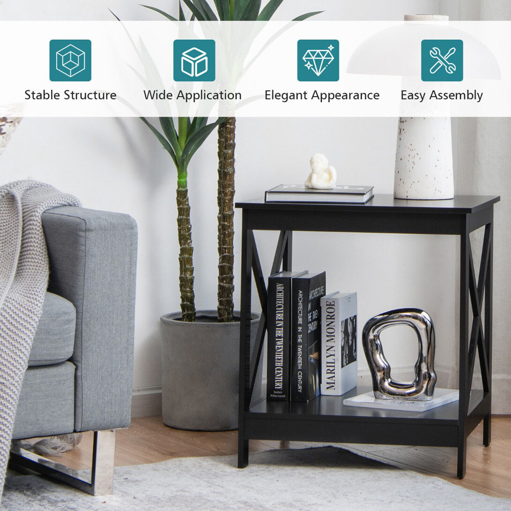 Elevate your home decor with the Costway Single Shelf Black Wooden X-Shaped Bedside Table. This is a versatile addition that seamlessly blends functionality with a stylish flair. Featuring a spacious tabletop and an additional open bottom shelf, this piece is perfect for keeping daily essentials and decorative items within easy reach. Its unique X-shaped design not only enhances the table's stability but also adds an aesthetic charm that complements any room—be it a living room, bedroom, or office. Crafted from thick MDF, this table ensures durability and stability for years to come. Whether used as a chic side table, an end table, or a nightstand, it promises to be an indispensable part of your living space.
