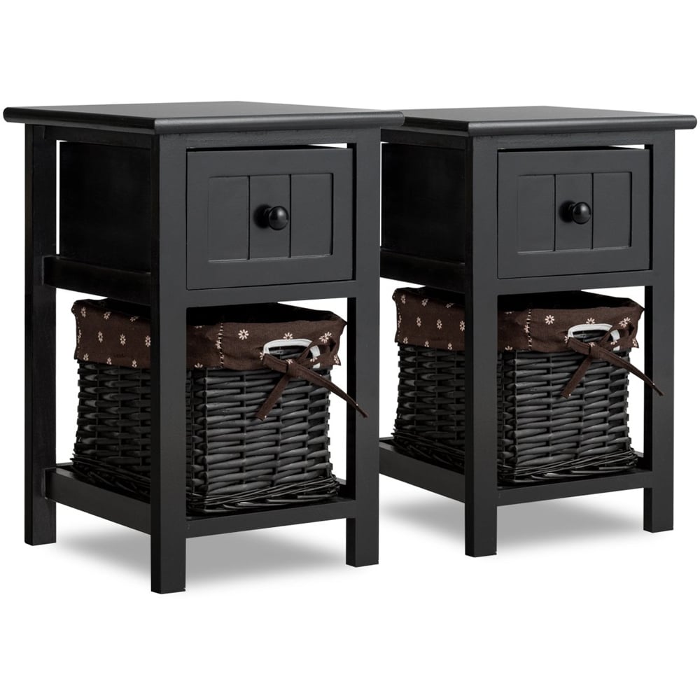 Elevate your bedroom's charm with the Costway 2 Shelf Single Drawer Black Wood Nightstand with Basket, a perfect blend of functionality and style. Crafted from durable paulownia wood, this nightstand boasts a robust load-bearing capacity of up to 50kg, ensuring it can handle all your essentials with ease. The combination of a smooth wooden drawer and a quaint wicker basket offers ample storage while adding a touch of rustic elegance to your space. Its compact and space-saving design allows it to fit snugly in any corner, making it a versatile addition to not only your bedroom but any room in need of a stylish storage solution. With its easy-to-clean surface and removable basket lining, maintaining this nightstand is a breeze, ensuring it continues to adorn your home with its elegance for years to come.