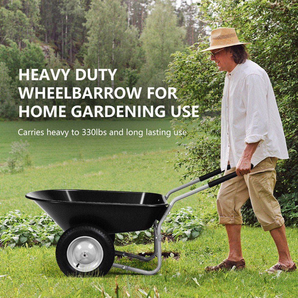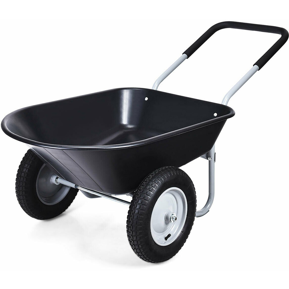 Transport heavy or bulky items with the Costway Black Garden Trolley featuring Pneumatic Tyres 150kg. This garden barrow, equipped with dual wheels, is perfect for everyday farm and garden tasks. It boasts a sturdy steel frame and a polypropylene container that combines functionality with an elegant design, making it easy to transport heavy loads. The trolley evenly distributes weight, ensuring a stable and upright position. It includes a large, wide pulling handle and 33 cm pneumatic tyres that enhance balance and manoeuvrability. Additionally, loading and unloading fertilizers and other materials for garden maintenance is made simple. The triangular support base allows the trolley to stand upright for extended periods. The handle, made from PE material, along with the oversized pneumatic tyres, provides added convenience in movement. This trolley is suitable for a variety of settings, including patios, warehouses, and farms. Detailed and straightforward instructions make assembly quick and easy.
