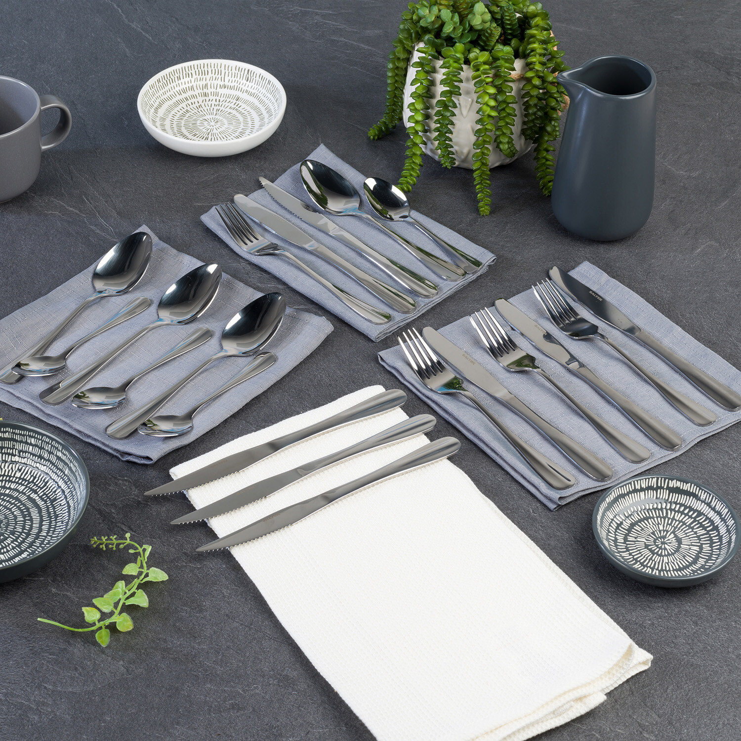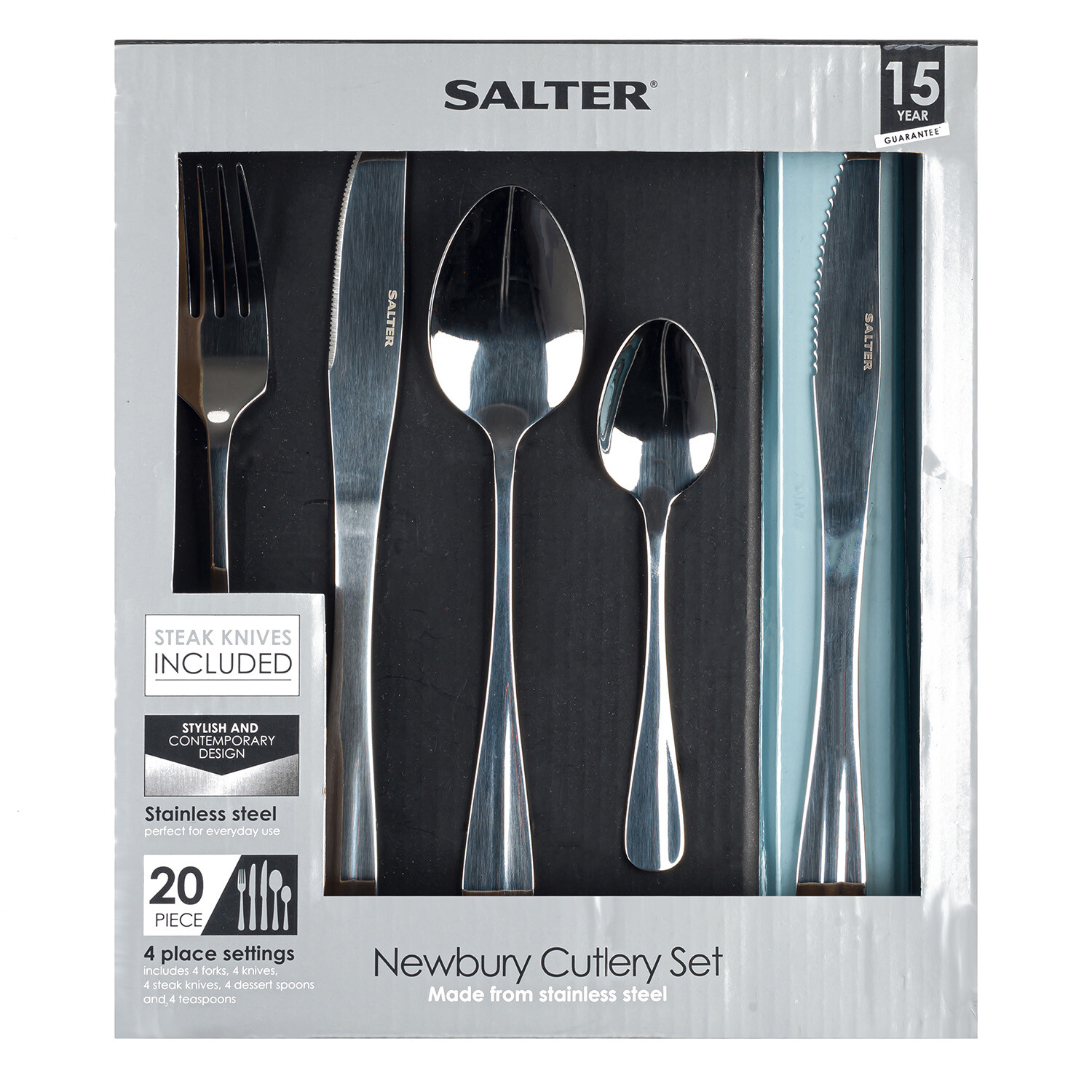 Give an elegant touch to your table setting with this 20-Piece Salter Newbury Cutlery Set. The 20-piece set includes four steak knives, four dinner knives, four forks, four teaspoons and four dessert spoons - perfect to create a four-place setting. Each piece of this set is made from stainless steel, making it durable while giving it a classic mirror-polished finish. Being dishwasher-safe, it's easy to clean too! A practical addition to your household!