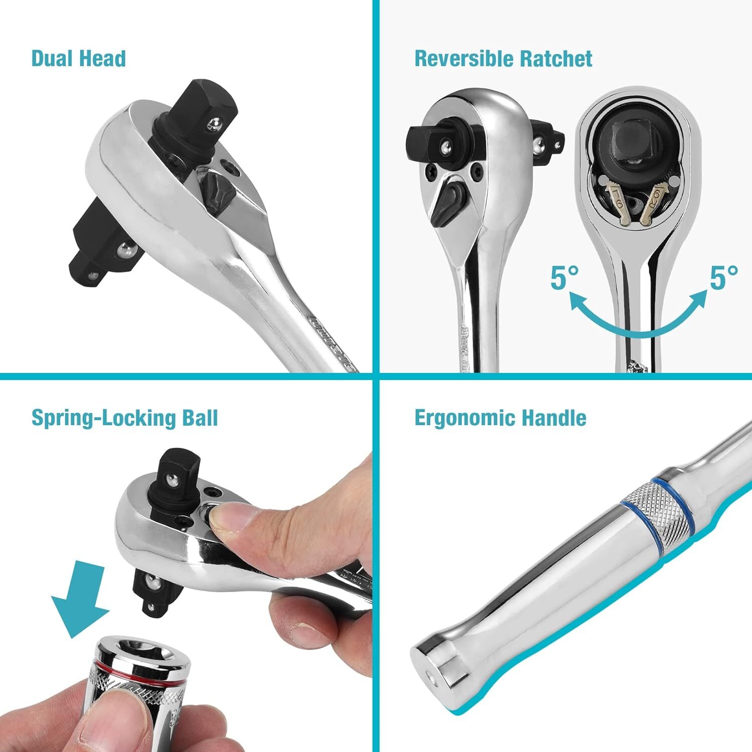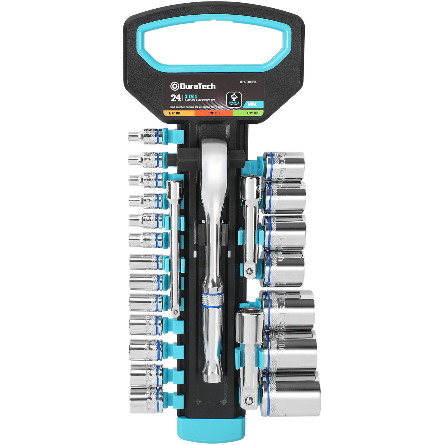 Equip your workspace with this 24 Piece DuraTech 3 in 1 Rachet and Socket Set. Designed for professionals, mechanics and DIY enthusiasts, this set is great for tasks that demand high performance and reliability. The set includes various sizes ensuring you get the right fit for any fastener. Durable and robust, the pieces are crafted using chrome vanadium steel providing strength and resistance to wear. Easy to carry, the plastic storage rack helps keep your sockets organised and makes portability a breeze.
