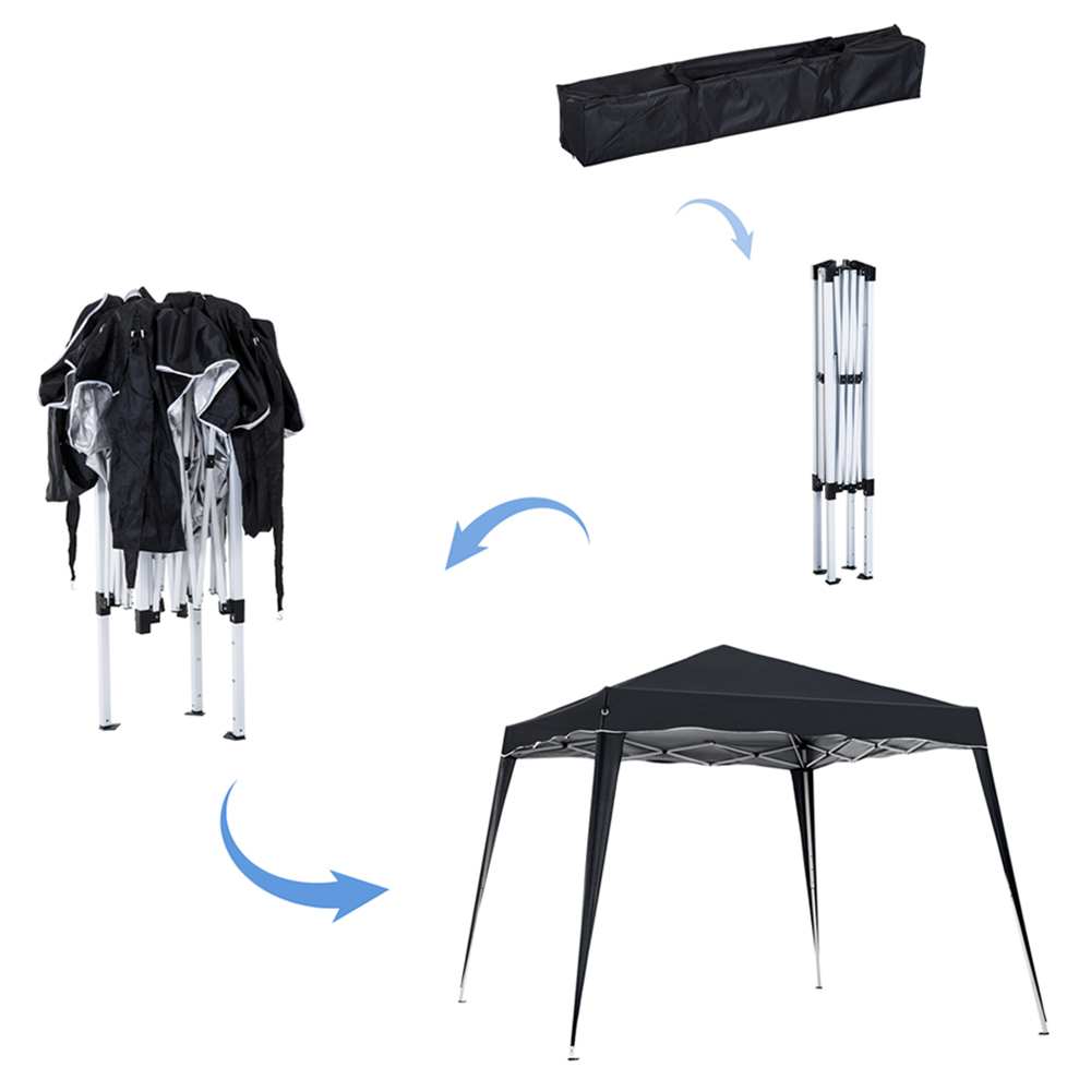 The Outsunny Awning Marquee Pop-Up Gazebo Tent in black is the ideal solution to keep your group of family or friends shaded during outdoor gatherings. Measuring 2.5 x 2.5m, this tent offers enough room for setting up multiple tables in a variety of configurations. The water-resistant silver-coated cover made of 210D Oxford fabric helps to block harmful UV rays. The gazebo is made from a rust-resistant powder-coated steel frame to endure weather elements and comes complete with angled legs, four ropes and eight stakes for stable standing. Plus, it sets up in minutes with no tools required. Suitable for recreational use, the square-shaped tent works well for anything from summertime craft fairs, street festivals, picnics, events and more.