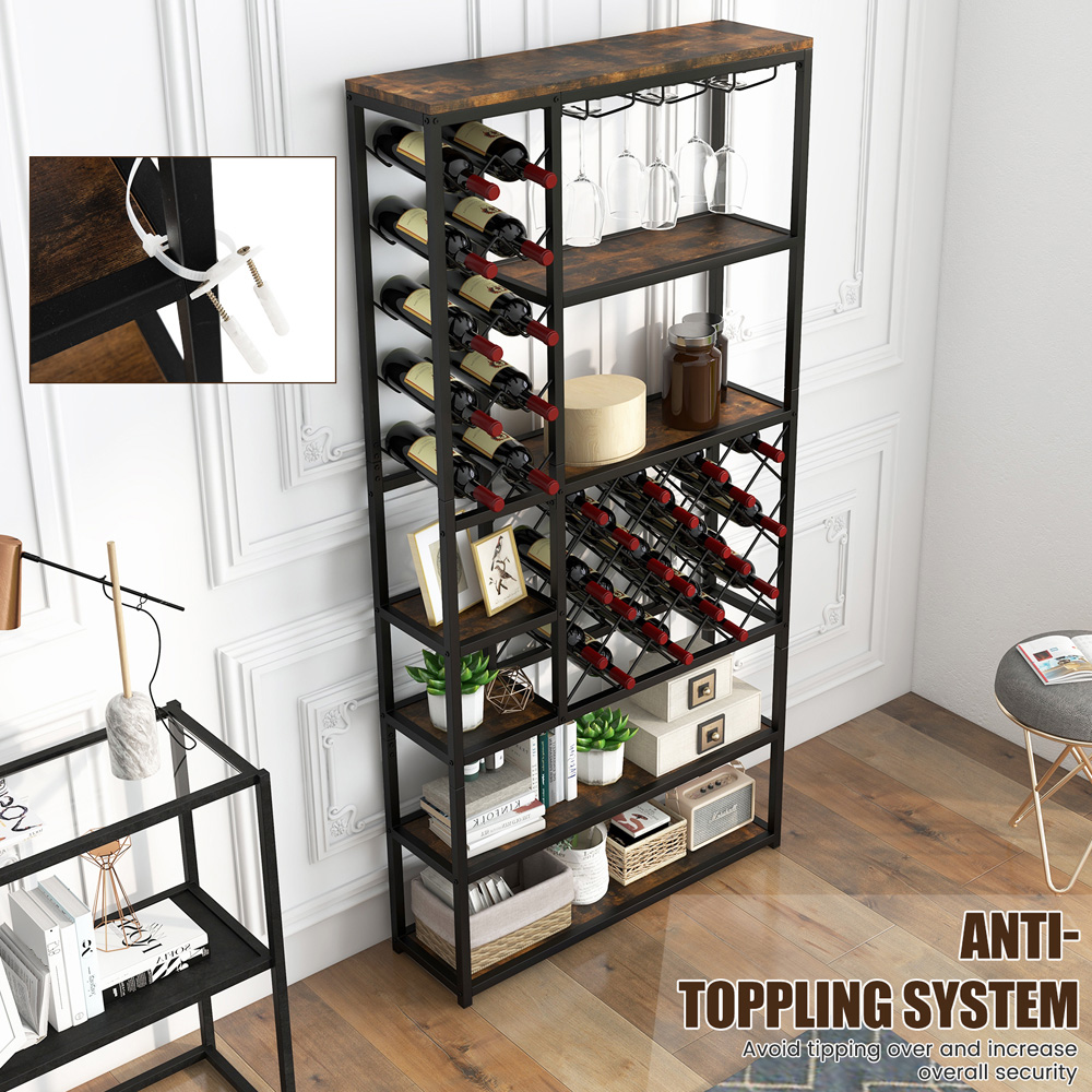 Elevate your wine storage with the Costway 6 Shelf 27 Bottle Wine Rack with Glass Holders. This freestanding unit features 3 rows of glass holders that can accommodate up to 12 glasses, and dual wine racks in W-shaped and X-shaped configurations that together hold 27 bottles. Crafted with a robust metal frame and an anti-toppling system, this wine rack ensures stability and security for your prized collection. The six-tier design not only stores your wine and glasses but also offers additional shelving for items like decanters, ice buckets, or decorative pieces. Its space-saving dimensions make it ideal for various settings, enhancing your home bar, kitchen, or dining area with ease.