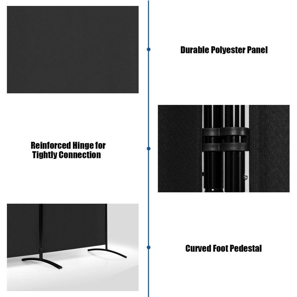Create a stylish divide in your room with the Costway 3 Panel Black Foldable Room Divider. Made from premium polyester fabric and steel tubes with curved feet, it offers both style and durability. Each panel connects with a strong hinge, allowing you to fold and unfold the screen easily. The three flexible panels allow you to partition larger spaces effectively. It works well for creating a private space in any room and can also serve as a background screen. With its simple and modern design, it enhances the beauty of your space. It folds for convenient storage and is perfect for establishing a private area. The durable hinges provide flexibility, and the lightweight design makes it easy to transport. Its multipurpose use makes it suitable for both home and office settings. The classic design fits well with most decor styles, while the solid steel frame and polyester fabric ensure it lasts a long time. The divider is easy to assemble with clear instructions.