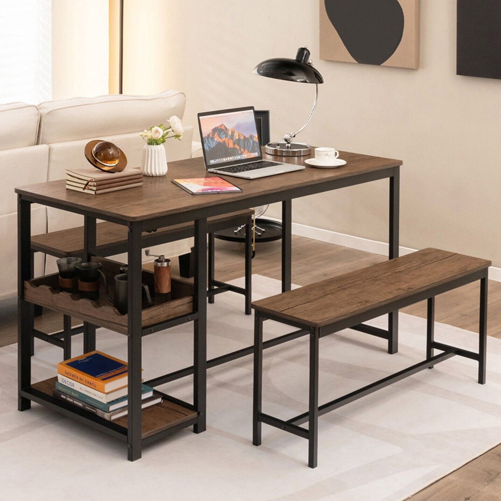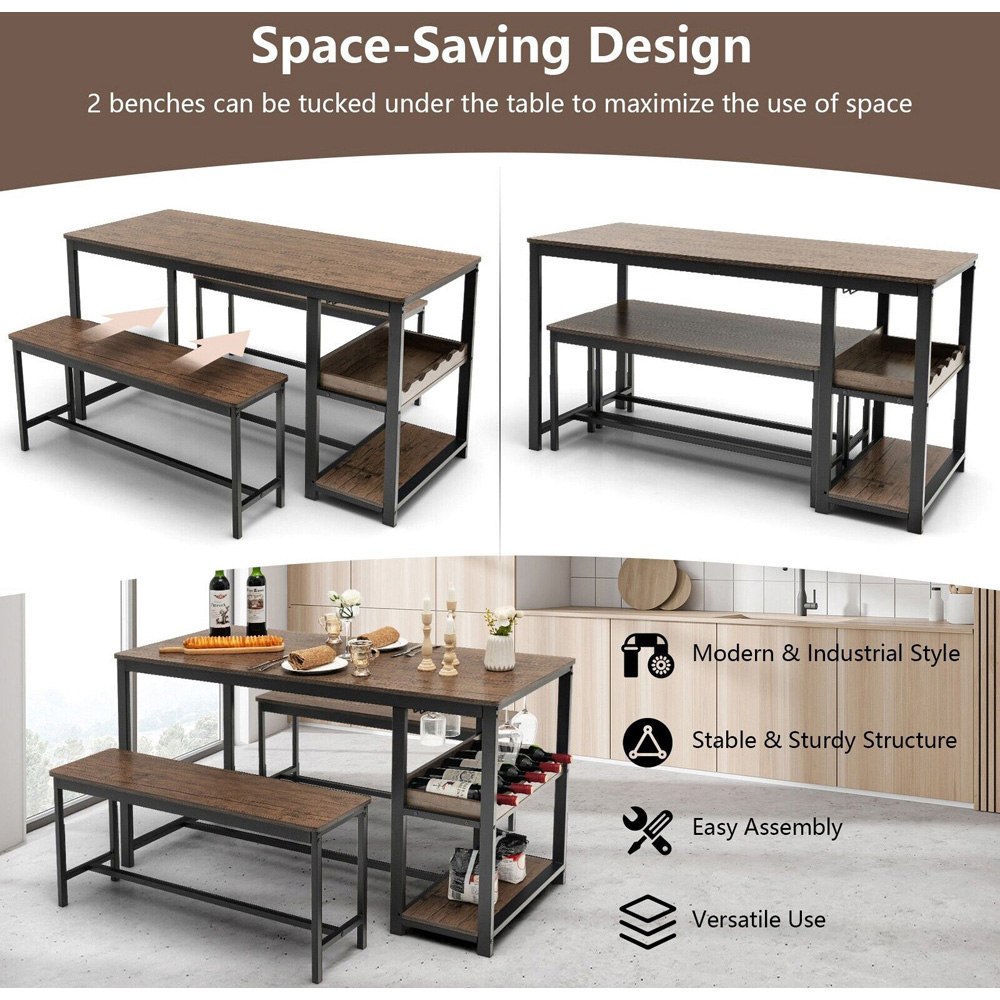 Elevate your dining experience with the Costway 4 Seater Dining Set with 2 Shelves Brown. This set includes one spacious table and two benches that comfortably seat up to four people, making it ideal for family meals, gatherings, or even as a work or study space. The table is not only a place to dine but also features a practical 3-tier storage shelf with hanging hooks for organizing wine bottles, glasses, and more. Crafted from engineered wood and a powder-coated iron frame, this dining set promises durability and stability with its I-shaped structure. The rustic chic style adds a trendy farmhouse flair to your dining area, and the space-saving design allows the benches to be tucked neatly under the table, perfect for small spaces.