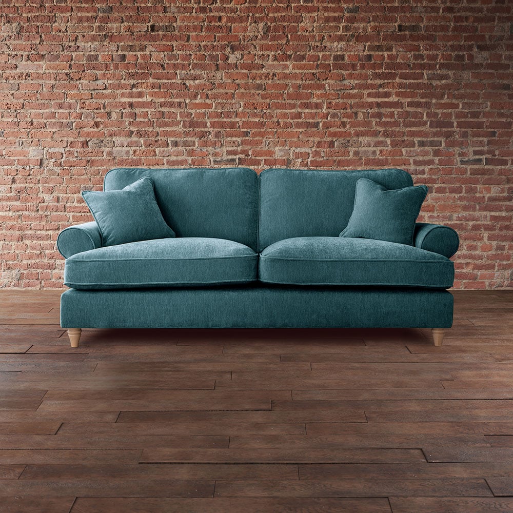 Go for a comfortable retreat with the The Victoria 3 Seater Emerald Sofa. This handcrafted piece exudes timeless elegance and sophistication with its classic design and luxurious appearance. Its scroll arms and extra deep seat cushions exude opulence, making it a stunning addition to any space. The soft-touch fabric is not only luxurious but also easy to professionally clean. It effortlessly combines timeless style with contemporary appeal and comes with scatter cushions for extra comfort. Its back cushions, filled with soft-fill polyester fibre, require regular plumping to maintain their shape and comfort. The deep pocket sprung seat cushions ensure optimal comfort and support. Topped off with modern pale wood legs, this is a true statement piece. Additionally, it can be professionally cleaned and will be delivered to your room of choice, with the packaging removed for your convenience.