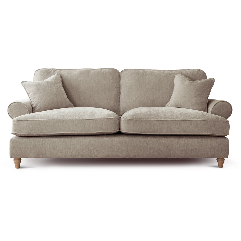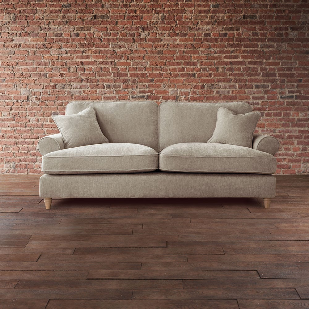 Go for a comfortable retreat with the The Victoria 3 Seater Putty Sofa. This handcrafted piece exudes timeless elegance and sophistication with its classic design and luxurious appearance. Its scroll arms and extra deep seat cushions exude opulence, making it a stunning addition to any space. The soft-touch fabric is not only luxurious but also easy to professionally clean. It effortlessly combines timeless style with contemporary appeal and comes with scatter cushions for extra comfort. Its back cushions, filled with soft-fill polyester fibre, require regular plumping to maintain their shape and comfort. The deep pocket sprung seat cushions ensure optimal comfort and support. Topped off with modern pale wood legs, this is a true statement piece. Additionally, it can be professionally cleaned and will be delivered to your room of choice, with the packaging removed for your convenience.