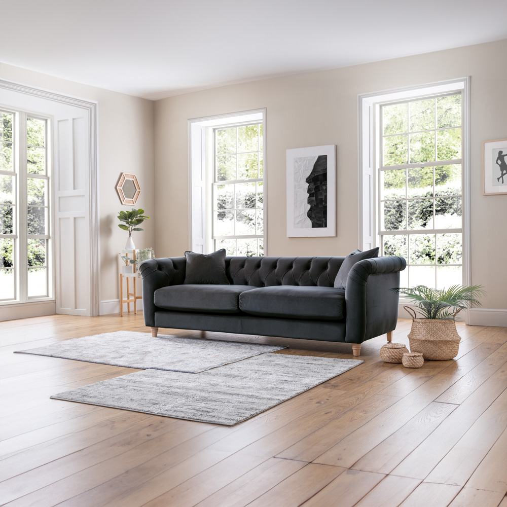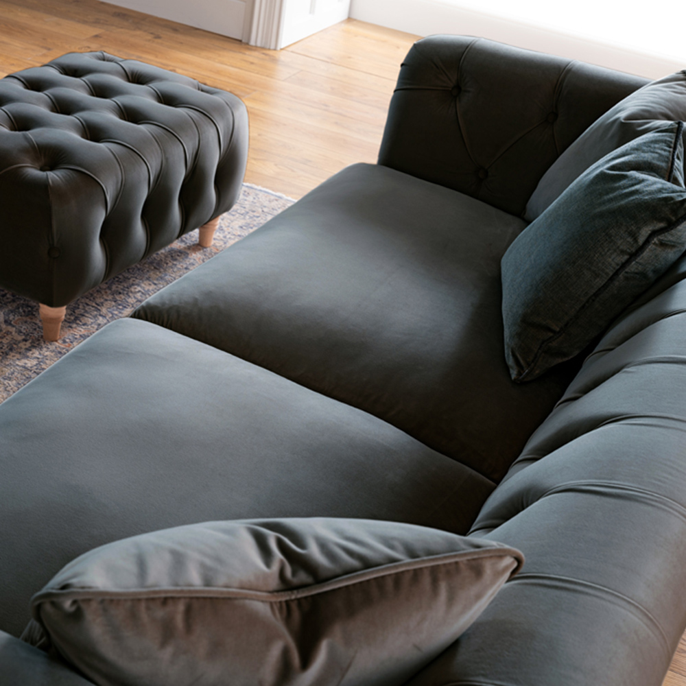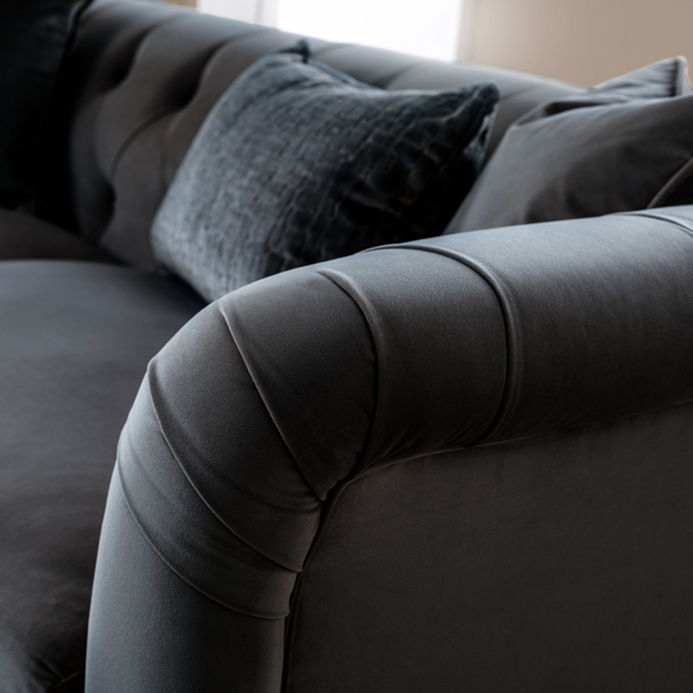 Upgrade your living space decor with this 3 Seater Midnight Blue Velvet Large Sofa. It features fully reversible seat cushions with a pocket spring interior core topped with feathers and fibre for comfort. This sofa is adorned with a soft touch, crush resistant velvet to add a touch of charm to your space. Stylish and comfortable, it flaunts deep hand buttoning and soft padded arms that provide added ease. With this plump and sumptuous sofa, elevate your home's ambience easily.