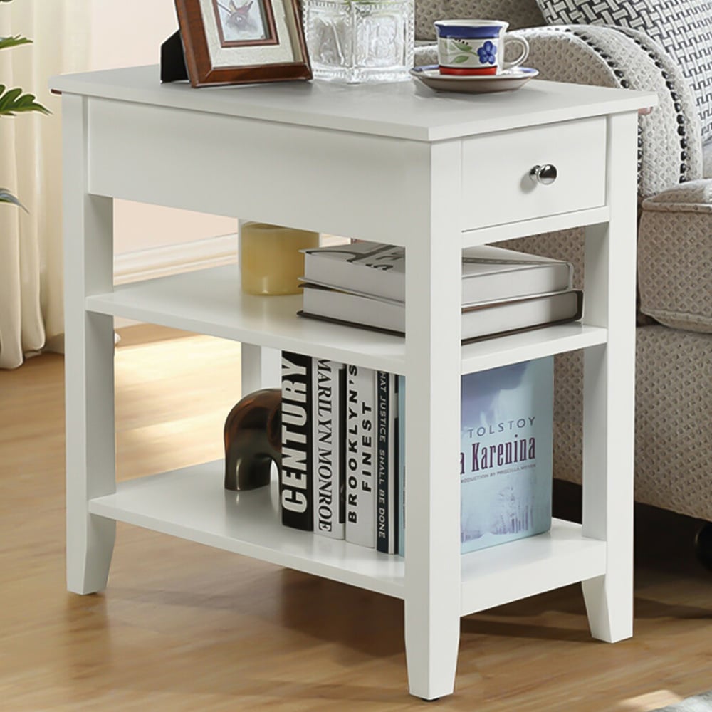Elevate your living space with the sleek and functional Costway Single Drawer 2 Shelf White Coffee Table. Perfectly blending modern aesthetics with classic style, this end table is a versatile addition next to your sofa, bed, or any interior furniture. Its compact design is ideal for narrow spaces, ensuring it doesn't overwhelm your room while providing ample storage with one drawer and two open shelves. The contrasting metal pull enhances the table's look and offers easy access to stored items. It is a practical yet stylish choice for storing everyday necessities like keys, remote controls, or private items.