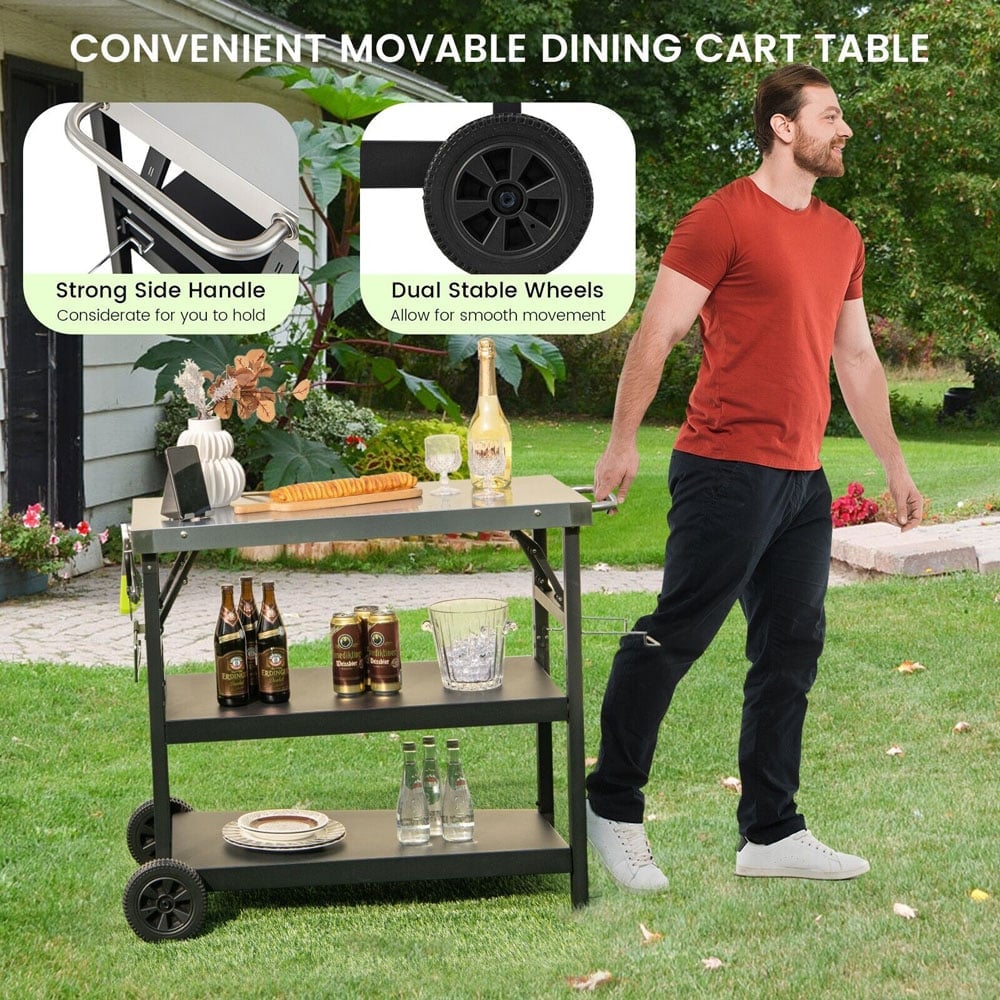 Elevate your outdoor gatherings with the Costway 3 Tier Black Foldable Stainless Outdoor Cart with Wheels, a robust and versatile companion that ensures everything you need is within arm's reach. Crafted from high-quality stainless steel, this cart is not only strong but also water-resistant, making it ideal for long hours of use during any weather. Its spacious 91 x 45cm operating surface comfortably hosts a variety of ingredients without feeling overcrowded. With features like an adjustable middle shelf, integrated holders for spices, trash, and tissues, plus four tool hooks, this cart simplifies your outdoor cooking and hosting. The two wheels and side handles offer effortless mobility, and its foldable design makes storage and transport as easy as pie.