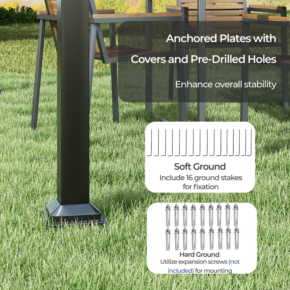 This 310 x 310 cm outdoor pergola provides a 9.5 m2 large footprint, which is ideal for enjoying outdoor entertainment with your family and friends. Specially, it features a retractable canopy, creating an ideal level of shade and protection as weather conditions change. And it can be easily retracted by a convenient rope loop and securely locked in place with the magnetic locking system. Besides, the canopy is crafted of premium polyester fabric, offering reliable protection against the elements. Thanks to its thick supporting columns and 4 corner reinforced plates, this pavilion provides unparalleled durability and stability. With its unique and elegant appearance, it also adds a touch of charm and style to your outdoor living space. Retractable Canopy: The outdoor pergola is equipped with a retractable canopy, which could meet different needs of full shade, partial sunlight, or open sky views. And there is a convenient rope loop for easy adjustment. When fully opened, the canopy can be secured by the rope loop and a magnetic safety locking system, preventing the canopy from swaying during windy conditions. Great Wind Resistance: The metal pergola is equipped with anchored plates with covers and pre-drilled holes, which are designed to firmly secure the pergola on various different types of ground. The package includes 16 metal stakes for fixation on soft ground. Furthermore, for concrete floors or wood floors, you can utilize expansion screws (not included) for mounting. Reliable Construction: Supported by thick columns measuring 80 x 80 mm (L x W), the patio pavilion provides a solid and reliable foundation for the entire structure. Additionally, constructed of heavy-duty metal, it also offers exceptional durability for long-term outdoor use. Weatherproof Canopy Fabric: The canopy is crafted of premium polyester fabric, which is sun-protective, drizzle-resistant, fade-resistant, and tear-resistant, providing better protection for outdoor activities. Moreover, it features flame resistance, ensuring safety and longevity. Spacious and Versatile Sun Shelter: This outdoor pavilion measures 310 x 310 x 225 cm (L x W x H), providing ample shading space for various outdoor activities. Whether used as a grilling gazebo, a hot tub enclosure, or an outdoor dining and entertainment area in your backyard, deck, garden, or porch, it can be a perfect choice.