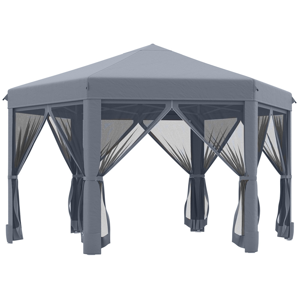 The Outsunny 3.2m Grey Hexagonal Pop-Up Gazebo with a side is great for outdoor parties, gatherings and camping trips. It features a hexagonal canopy made from breathable polyester fabric with PU coating to provide a larger and more spacious space and protect you from UV and direct sunlight. The height of pop up the garden marquee can be easy to adjust up and down between three levels. With a foldable steel frame, our outdoor gazebo is easy to carry and saves space. With six removable mesh sidewalls, it ensures good ventilation and protects from mosquitos. Comes with guy ropes and ground stakes to set it into place comfortably, it can all be folded and stored in a bag. With a straight-leg design and mesh sidewalls, this pop-up party tent is suitable for a variety of outdoor activities.