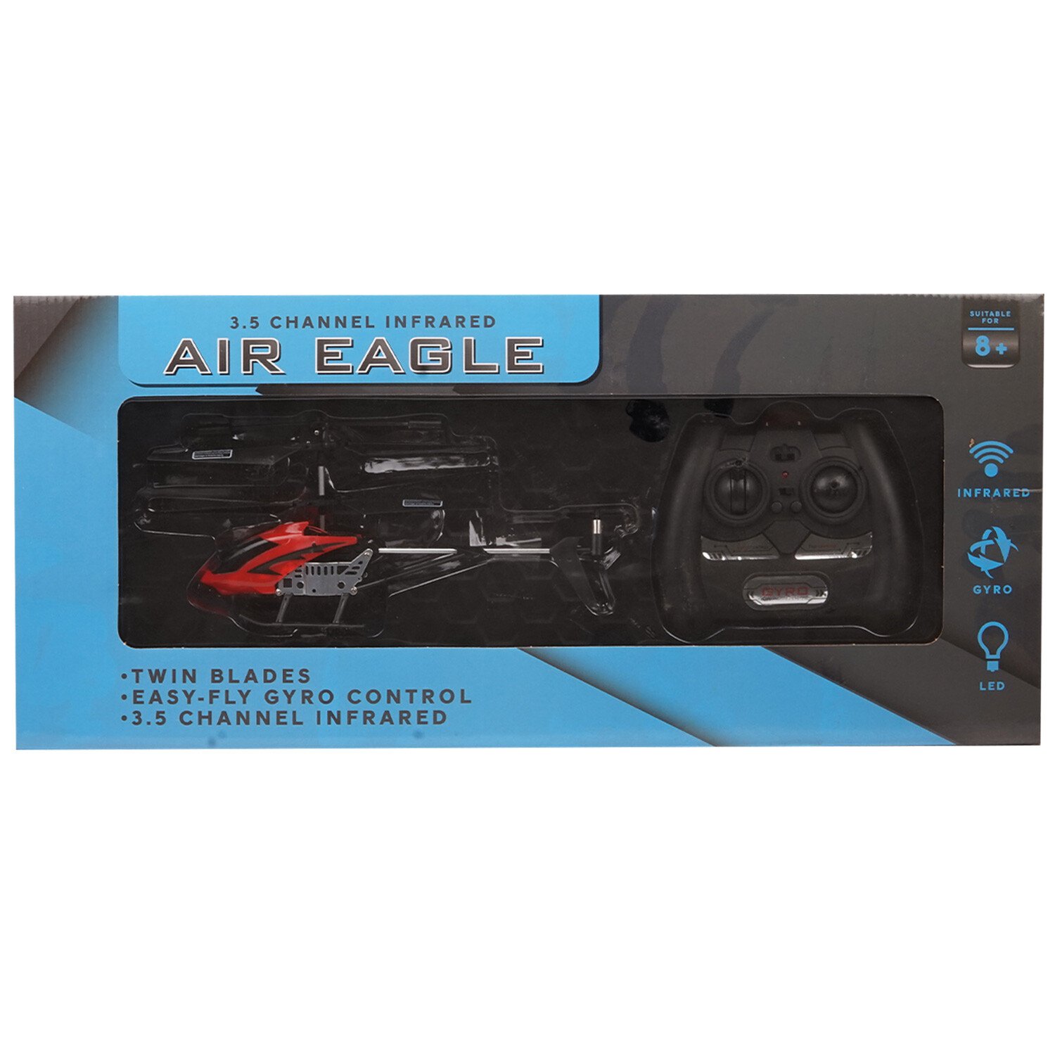 Enjoy precise manoeuvrability in any direction with this remote-controlled 3.5 Channel Infrared Air Eagle Helicopter. The built-in gyro and co-axial rotor system offer an easy, stable flight, even for beginner pilots. Air Eagle offers longer flight times and uncompromised durability! It can endure all those little bumps and scratches. There's no assembly needed and it's ready to fly straight from the box after 1 short charge. Plus, with LEDs added, it's the perfect toy for flying indoors and out.