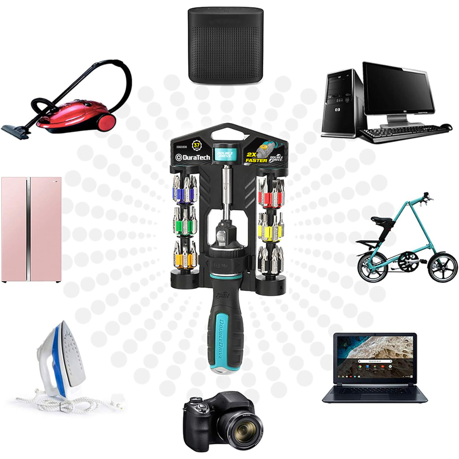 Upgrade your toolkit with this 37 Piece DuraTech Double Drive Stubby Screwdriver Set. Ideal for both professional and home use, this patented double-drive technology with ratchet works two times faster than any standard screwdriver. Its design can improve your work efficiency and help in easing your labour. Durable and robust, the set features chrome-vanadium blades and bits for durability. Comfortable to use, it comes with an ergonomic and slip-resistant grip handle for a hassle-free experience. This set includes a total of 37 pieces to cover most of your DIY and fitting needs.