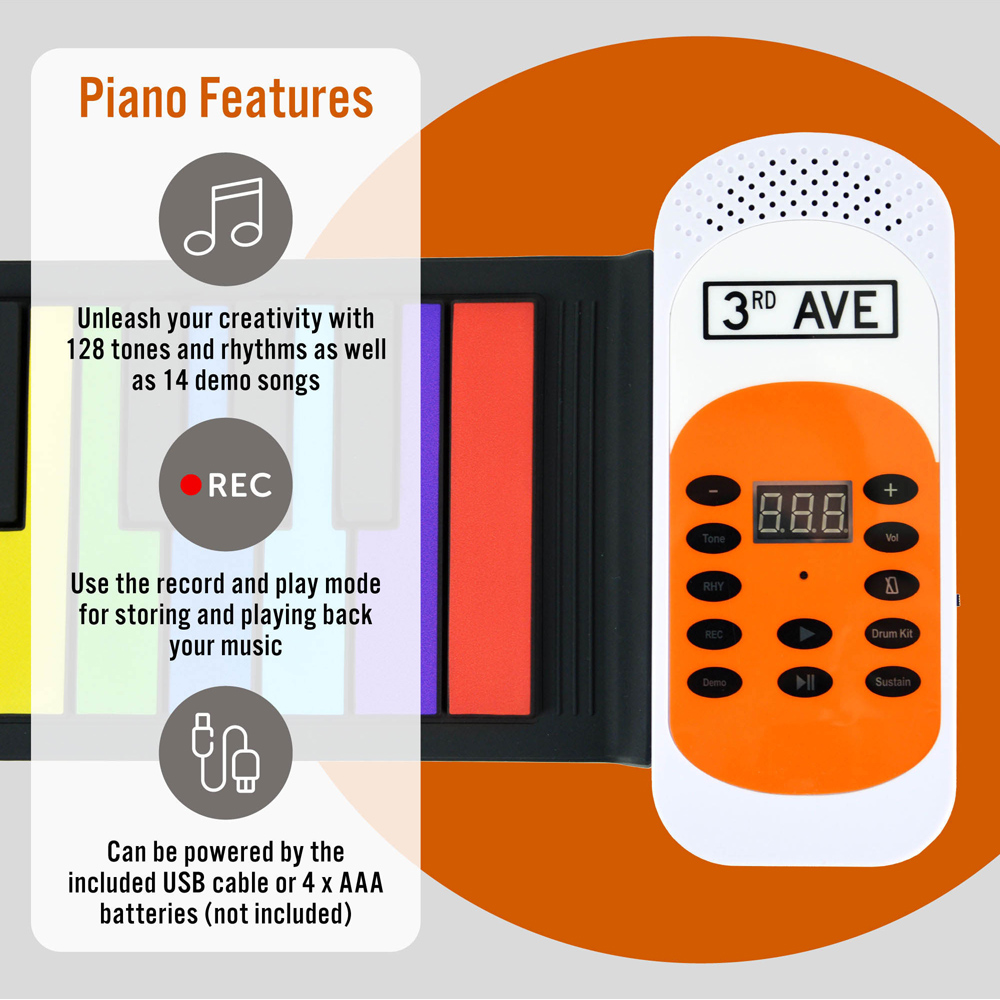 Unfold melody with the 3rd Avenue 49 Key Rainbow Soft Touch Roll Up Piano. Designed with young musicians in mind, this 49-note keyboard is the perfect instrument to inspire creativity, foster a love for music and provide endless hours of entertainment. The colourful soft-touch keys make it easy to play, quick to learn and fun. The roll-up design is incredibly portable, making it convenient for storing and transporting. The piano includes an impressive 128 sounds and 128 backing rhythms for hours of fun. The built-in speaker delivers a clear and crisp sound, allowing your child to share their music with friends and family. It's also equipped with a headphone jack for quiet practice sessions. The rainbow keyboard piano includes a USB power cable for convenience but can also be powered by four AAA batteries (not included), giving your child the flexibility to play anytime, anywhere.