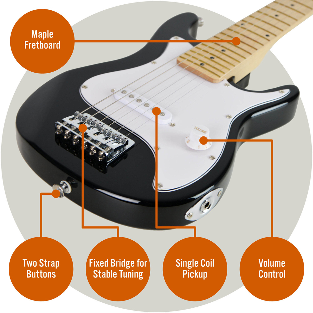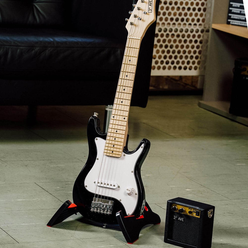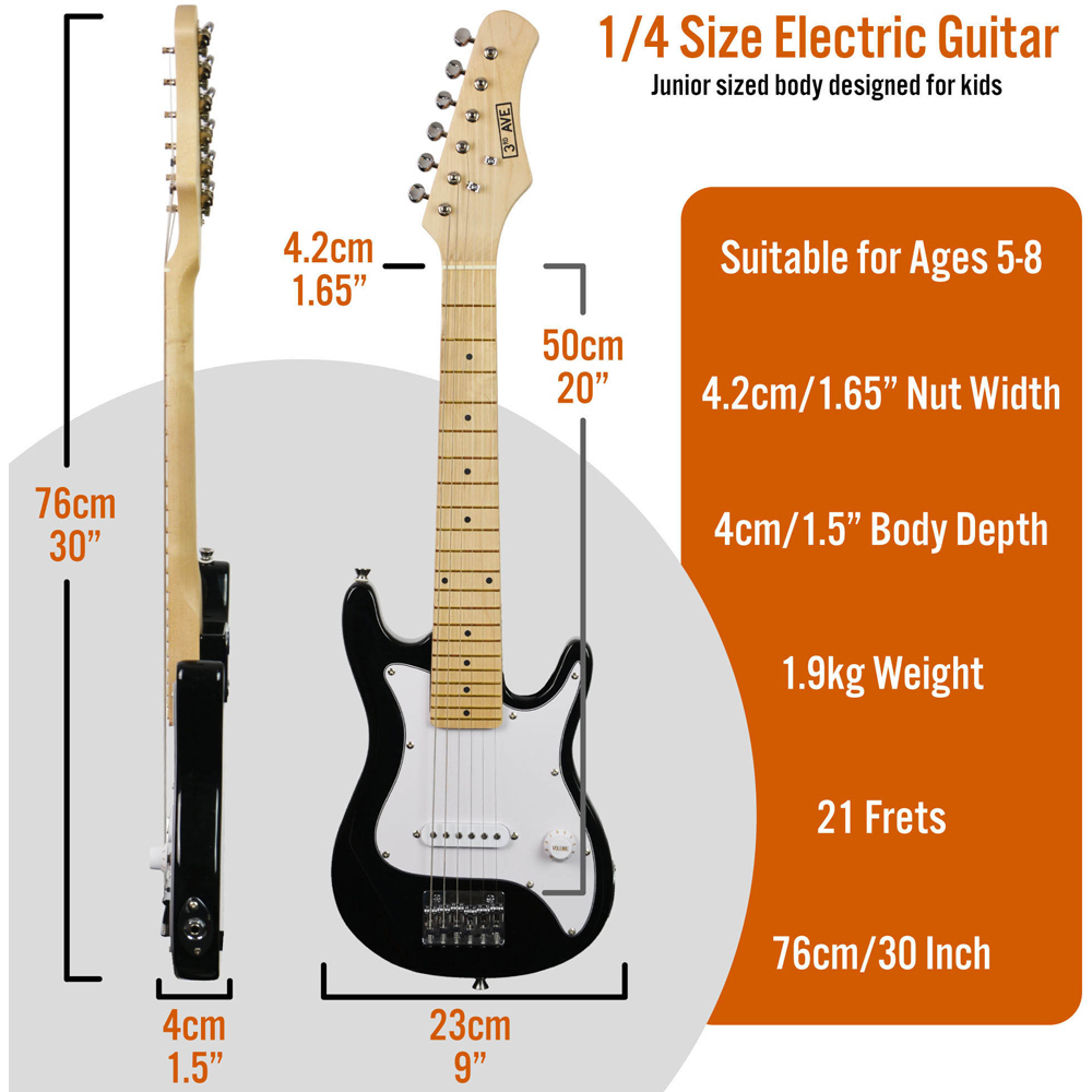 Let the young minds unleash their inner rockstar with the 3rd Avenue Black and White Junior Electric Guitar Set. This set is perfect for young learners and kids looking to start playing the electric guitar. The classic double-cutaway body shape is designed to emulate the appearance of more professional models, and there is also a maple neck and fingerboard with black fret markers. With the classic-sounding single-coil pickup connected to a volume knob, this guitar proves easy to use and great sounding. The hardtail bridge features individually adjustable saddles, and the tuners provide good tuning that connects the strings to the guitar. Included in this pack is a gig bag, which allows for easy transportation or storage of your guitar. A guitar strap allows for comfortable playing while standing, and the guitar picks mean that you can play with ease. Included is a battery-powered amplifier that allows you to play with some good volume whether you’re at home, in lessons or anywhere else. The amp has volume and tone controls as well as the option for a clean or overdrive sound. A standard jack-to-jack cable is included, which connects your guitar to the amp. Due to the small size of this instrument, it is suitable for those aged around five to eight years old.