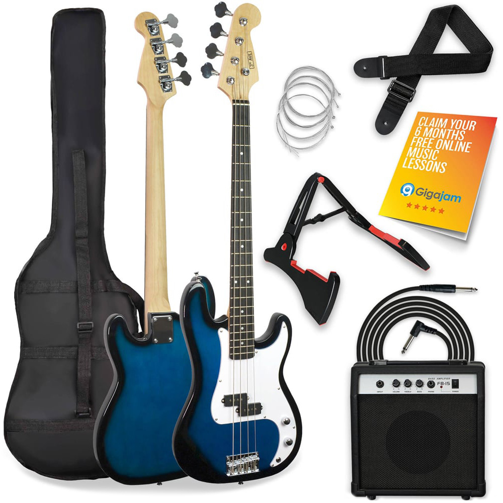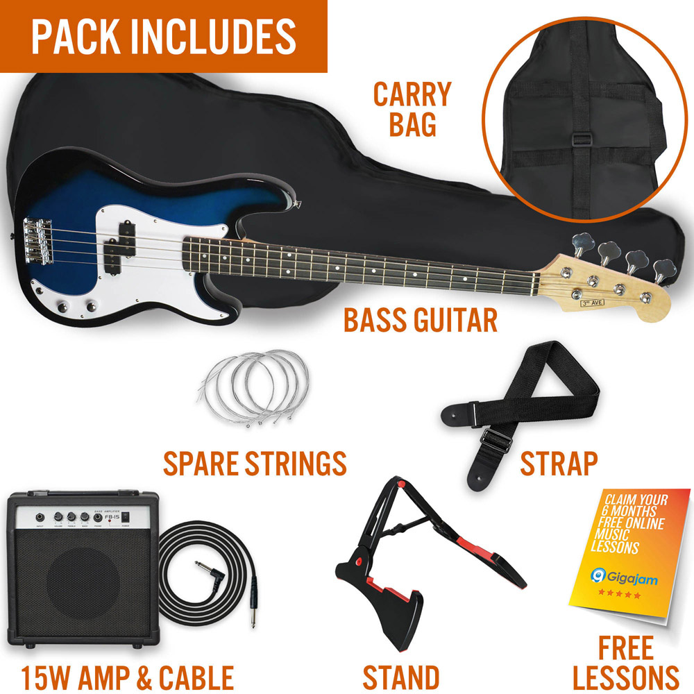 Make the world vibrate with the 3rd Avenue Blueburst Full Size Electric Bass Guitar Set. Shaped in an iconic designed P-style, this guitar is versatile enough for any genre of music. It is supplied in a high-gloss finish with a PVC white scratch plate and covered pickups to give a sleek and modern aesthetic. Included is a 15W amplifier, which is ideal for bedroom practice but will also allow you to get good volume for when you want to be heard. This amplifier also has a headphone socket for silent rehearsals, making it ideal for night practice or houses with thin walls. Some essential accessories are also included: a gig bag that allows easy transport and storage, a cable to make sure you can plug in straight away and get playing, a guitar strap, spare strings and a guitar stand.