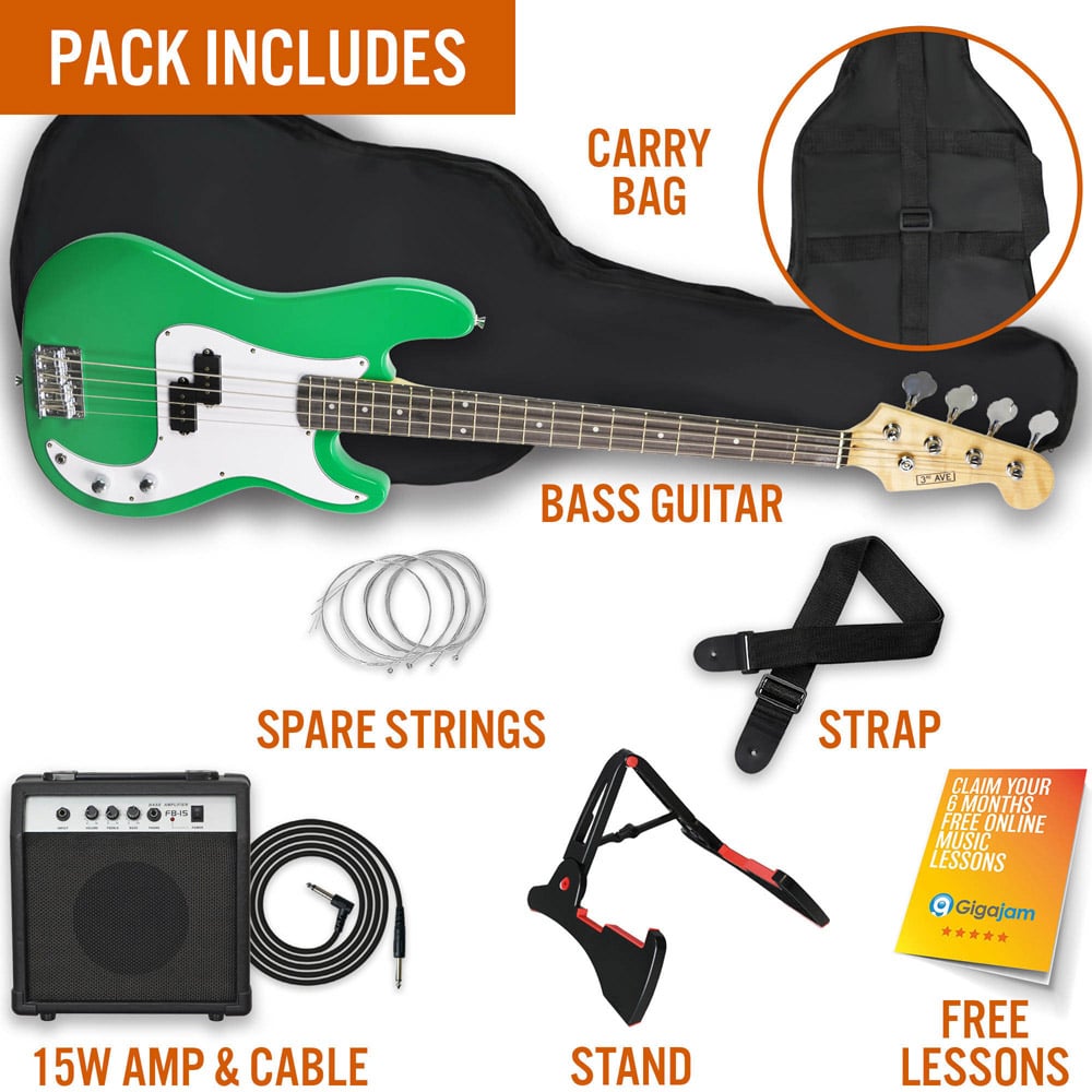 Make the world vibrate with the 3rd Avenue Green Full Size Electric Bass Guitar Set. Shaped in an iconic designed P-style, this guitar is versatile enough for any genre of music. It is supplied in a high-gloss finish with a PVC white scratch plate and covered pickups to give a sleek and modern aesthetic. Included is a 15W amplifier, which is ideal for bedroom practice but will also allow you to get good volume for when you want to be heard. This amplifier also has a headphone socket for silent rehearsals, making it ideal for night practice or houses with thin walls. Some essential accessories are also included: a gig bag that allows easy transport and storage, a cable to make sure you can plug in straight away and get playing, a guitar strap, spare strings and a guitar stand.