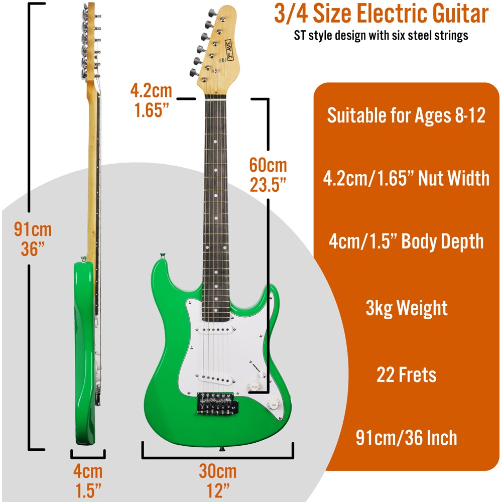 Learn to play with the 3rd Avenue Green 3/4 Size Electric Guitar Set. This excellent package offers a smaller guitar size, ideal for younger players, taking music lessons, or playing for fun. Aimed at beginners and built to a high-quality specification, this 3/4-sized instrument is ideal for ages 8-12 years. The electric guitar included in this pack follows a classic design and features a 22-fret neck, with two single-coil pickups and a whammy bar, which provides a versatile instrument suited for any genre or playing style. The contrasting pickguard provides a stylish appearance. The guitar pack includes a 5 Watt rechargeable amplifier, ideal for home practice. The amplifier features a volume knob, a tone control for brightness, and a switch for overdrive. Play silently with headphones if you prefer late-night practice. The amplifier includes Bluetooth connectivity, letting you play along with your favourite songs. The pack also features a padded gigbag for transport, a spare set of strings, a capo, a guitar stand for display, a guitar strap, some plectrums, and a cable to connect your guitar to the amplifier.
