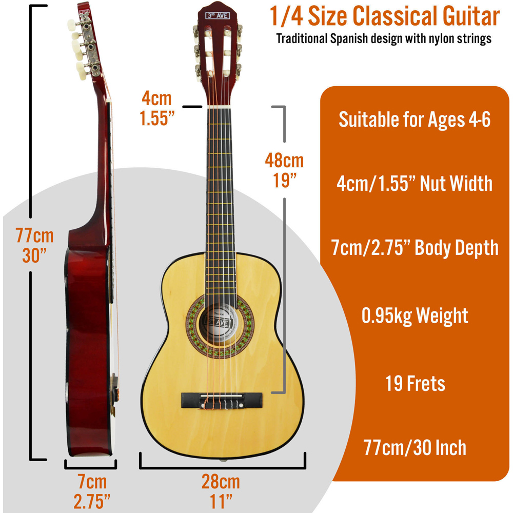 Compose your dreams with the 3rd Avenue Natural Quarter Size Classical Guitar Set. This classical guitar set is the perfect beginner instrument for the youngest of learners to start playing. Included are a few accessories that will prove useful while starting, meaning this pack provides excellent value for money. As this guitar is designed for beginners, it uses nylon strings, as is normal for a classical guitar. These strings provide low tension, which ensures that there isn’t a lot of strain on the fingers. The included gig bag features a comfortable back strap, making this ideal for carrying to and from lessons or for storage when the guitar isn’t in use. A spare set of guitar strings is also included, which is perfect just in case of any accidental breakages. This guitar is suitable for ages four to six years old.