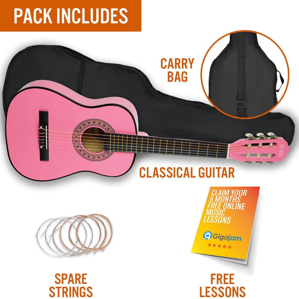 Compose your dreams with the 3rd Avenue Pink Half Size Classical Guitar Set. Coming with some essential accessories and being easy on the fingers, the set is perfect to start your musical journey. The guitar is fitted with nylon strings that have low tension to ensure avoiding any strain on the fingers while learning the basics and progressing. There is a gig bag, which features a back strap to ensure comfortable transport to lessons or school and is also suitable for storage when not in use. A spare set of strings is also included, which combats being stuck without strings in the case of an accident. This model is suitable for ages five to seven years old.