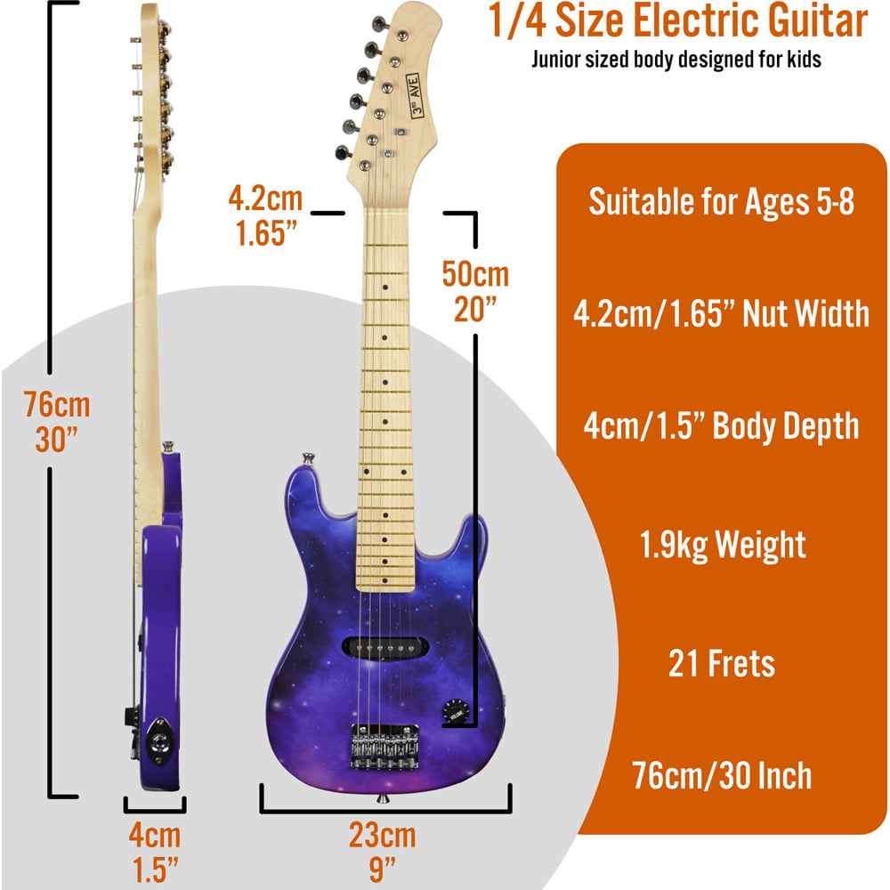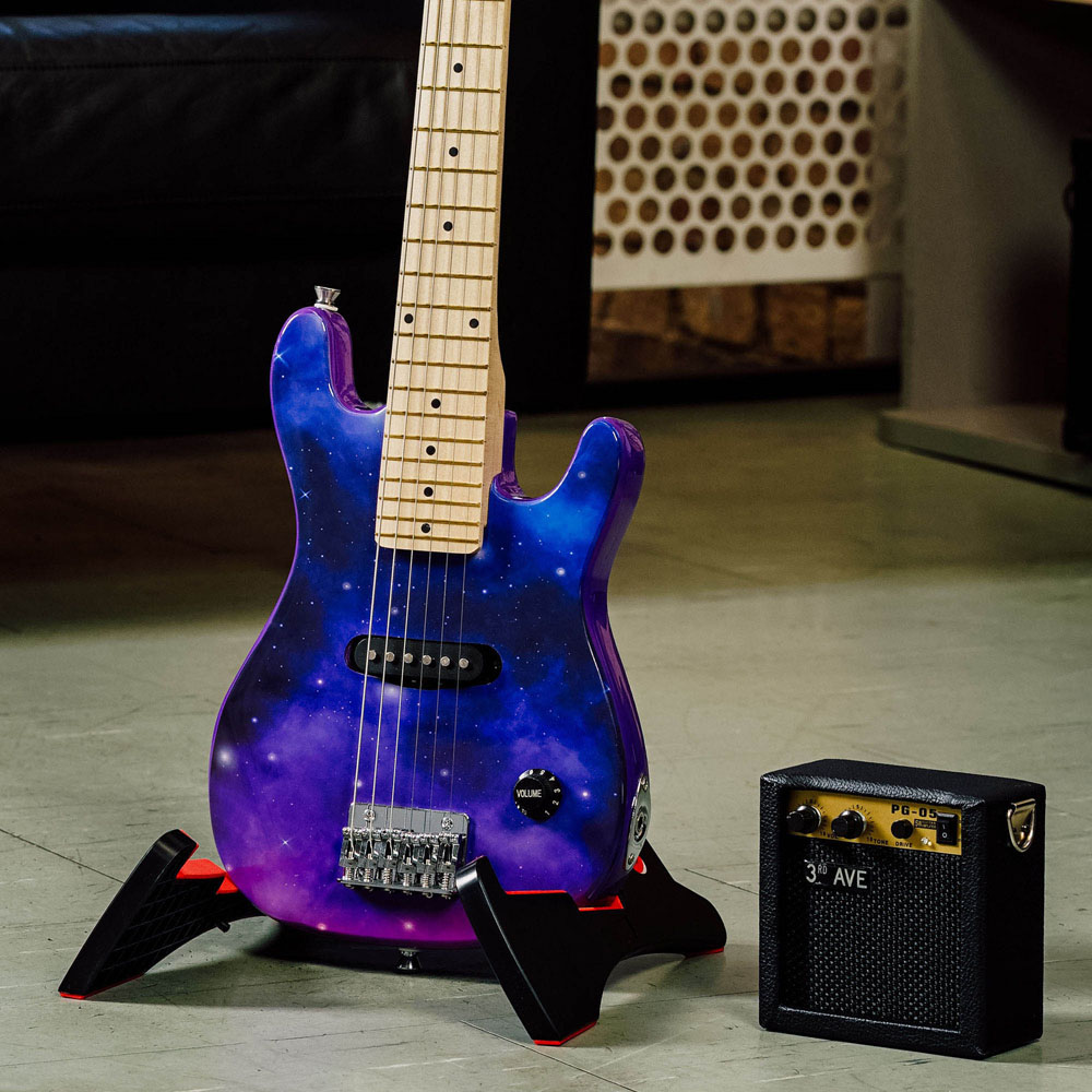 Let the young minds unleash their inner rockstar with the 3rd Avenue Purple Galaxy Junior Electric Guitar Set. This set is perfect for young learners and kids looking to start playing the electric guitar. The classic double-cutaway body shape is designed to emulate the appearance of more professional models, and there is also a maple neck and fingerboard with black fret markers. With the classic-sounding single-coil pickup connected to a volume knob, this guitar proves easy to use and great sounding. The hardtail bridge features individually adjustable saddles, and the tuners provide good tuning that connects the strings to the guitar. Included in this pack is a gig bag, which allows for easy transportation or storage of your guitar. A guitar strap allows for comfortable playing while standing, and the guitar picks mean that you can play with ease. Included is a battery-powered amplifier that allows you to play with some good volume whether you’re at home, in lessons or anywhere else. The amp has volume and tone controls as well as the option for a clean or overdrive sound. A standard jack-to-jack cable is included, which connects your guitar to the amp. Due to the small size of this instrument, it is suitable for those aged around five to eight years old.