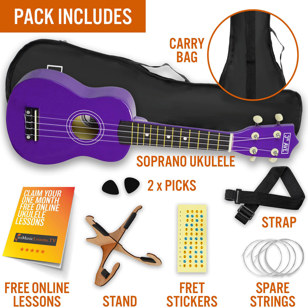 Add some notes to your travelling adventures with the 3rd Avenue Purple Soprano Ukulele Set. Making sure that you’ll always sound great, this set is ideal for first-time beginners, education or ensemble work. Equipped with a carry bag, so you can take your uke everywhere you go, whether that be school, lessons, a friend’s house or even on holiday. In this great value bundle, you also receive a spare set of nylon strings, wooden stands, picks, straps and fret note stickers. A one-month free trial is included with this ukulele from ProMusicLessons.TV. These lessons are ad-free and short, helping beginners understand and get to grips with the basics of ukulele playing quickly. Once you’ve signed up online, you can access your lessons on Apple, Android, Amazon Fire or Roku devices. You can also cancel it anytime. This ukulele is a soprano (21-inch) sized model, which is the easiest to get your hands around, especially for younger players.
