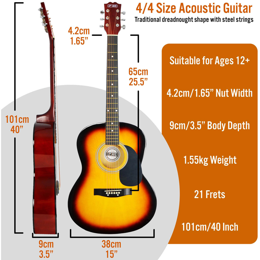 Find your rhythm with the 3rd Avenue Sunburst Full Size Acoustic Guitar Set. Being full-size, it is ideal for any learners who are 11 years old or older. This guitar package contains essential accessories, so you will have everything you need to get started. The classic dreadnought shape and the steel strings ensure great tonal balance as well as good projection. With nickel-geared tuners, the guitar stays in tune once the wood and strings of the instrument are used to the tension of being tuned up. Thanks to the strap buttons, which are found on the base of the body and at the heel of the neck, you can play this guitar comfortably while standing. The guitar has a black and white rosette and a black pickguard. Included within the package is a gig bag with a zip pocket, a set of spare strings to take care of any breakages or for when the strings attached get old, a couple of guitar picks and a nylon guitar strap.
