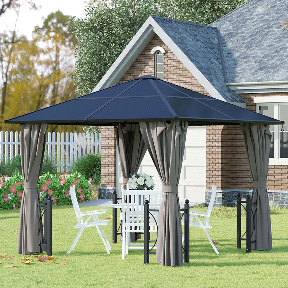 Enjoy the glamour and comfort of resorts in your backyard with this Outsunny 3 x 3m Grey Gazebo with Hardtop. This sturdy gazebo elevates your backyard, patio area, or other outdoor space by adding an element of elegance that is sure to impress your guests. Generously sized, this unit is ideal for comfortably holding many individuals. Durable and sturdy, the powder-coated and rust-resistant aluminium beams, steel columns, and polycarbonate hardtop roof make a reliable option for long-term use. For added convenience, it comes with protected sidewalls with fully enclosed zippered nettings to offer double water resistance and keep insects at bay. Apart from this, the top includes hooks for hanging a patio heater or lantern. Perfect for family gatherings, barbecues, afternoon picnics, camping, weddings, and other important events. Size: 3 x 3m.