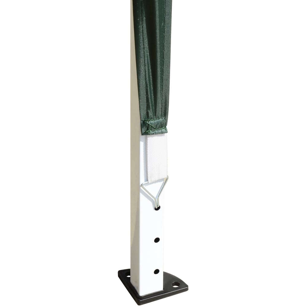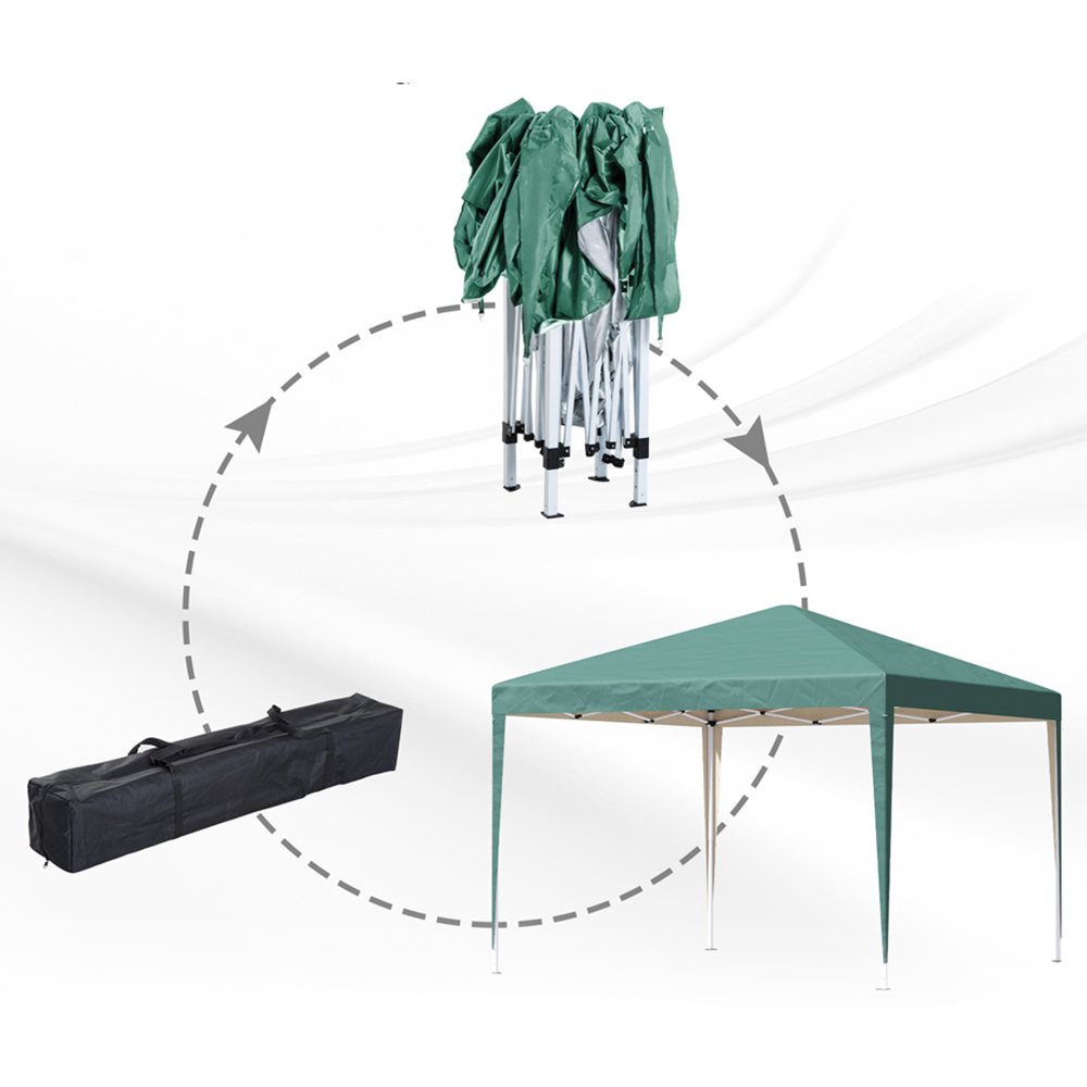 This Green Marquee Pop-Up Gazebo from Outsunny is a great, no-fuss outdoor shelter for family parties, weddings, picnics, sports events, outdoor vendors, craft fairs, job sites and camping trips. The foldable garden gazebo is constructed of rust and corrosion-resistant powder-coated steel framework for long-lasting durability. Its special 210D silver-coated Oxford cloth top protects you from the sun's harmful UV rays and is water-resistant. This garden shelter provides easy set-up and takes down in less than a minute. It also comes with a portable carrying case as well as four guy ropes and eight ground stakes for added stability. Size: 3 x 3m.