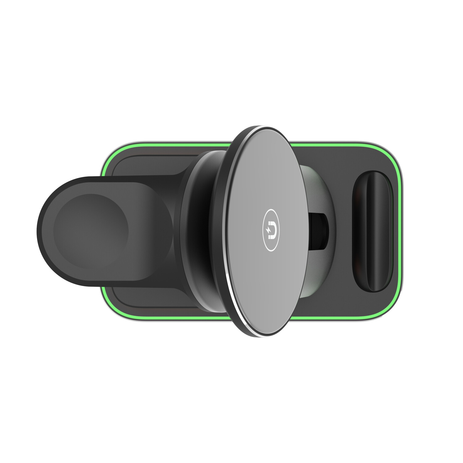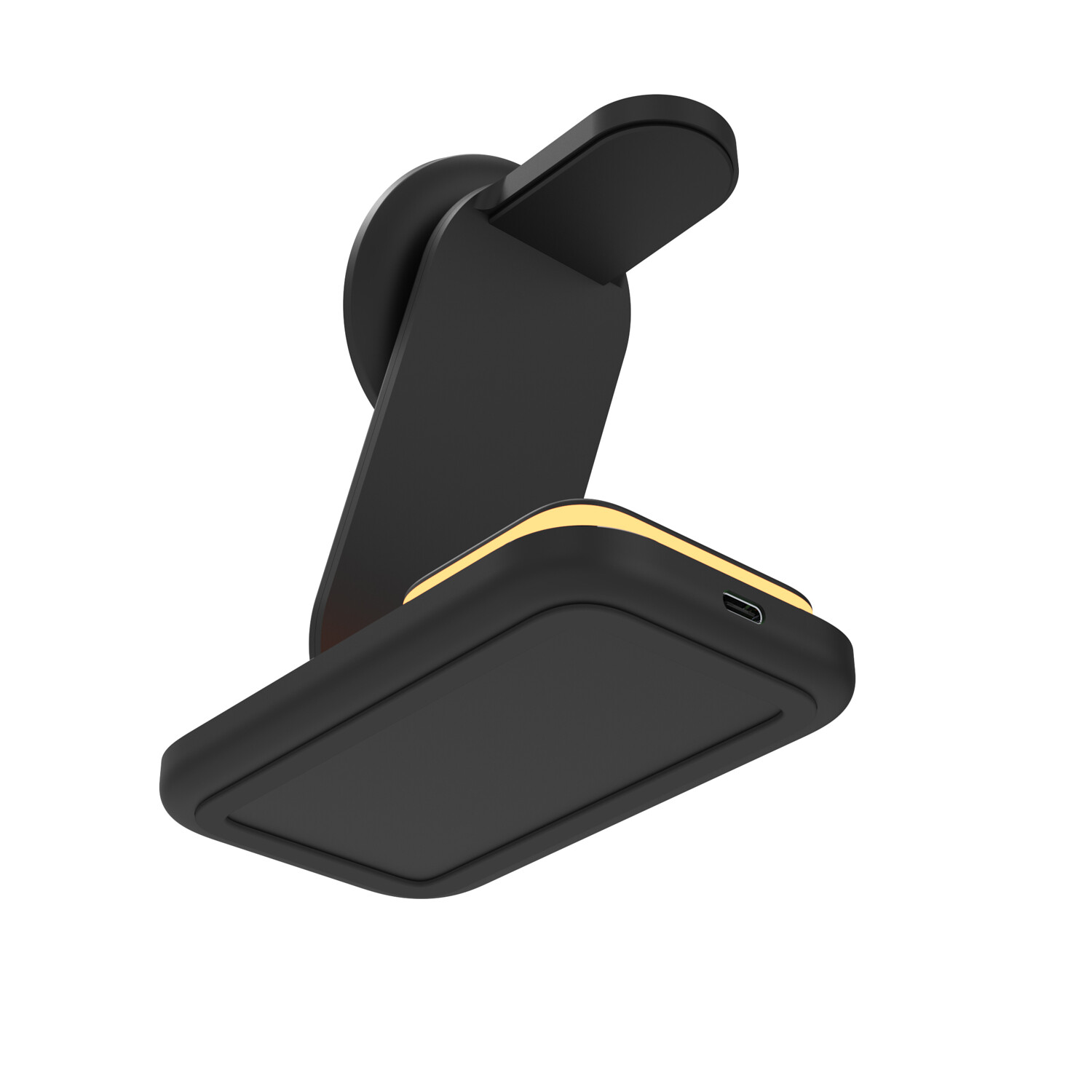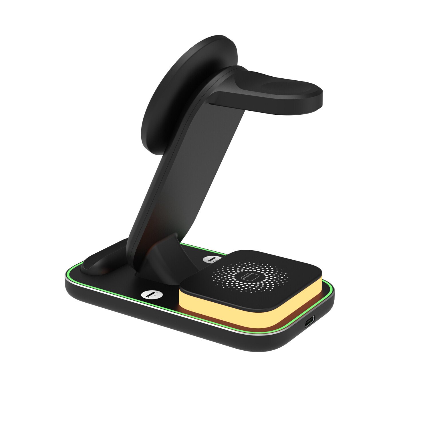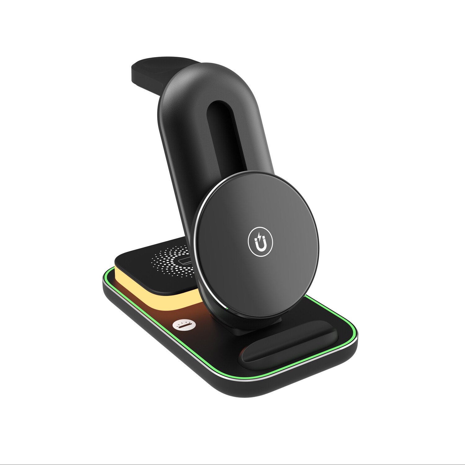 Power up your devices with the 4 in 1 Wireless Charging Stand. This versatile charging stand uses a magnetic wireless design to power up your mobile phones, smartwatches, and earphones quickly. Its adjustable suction cup can be repositioned up and down, accommodating phones of all sizes. The protective silicone pad keeps your devices securely in place, while the scratch-resistant construction makes it a great choice for efficiently charging devices.