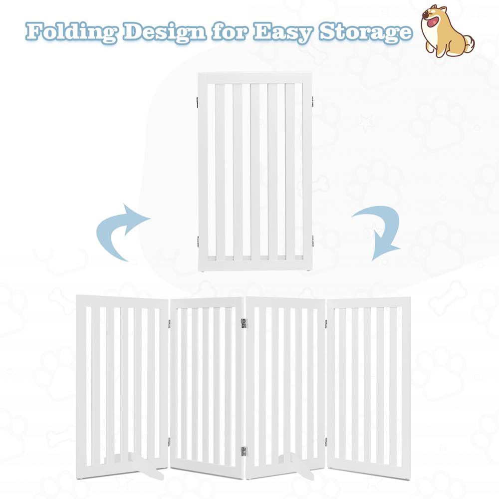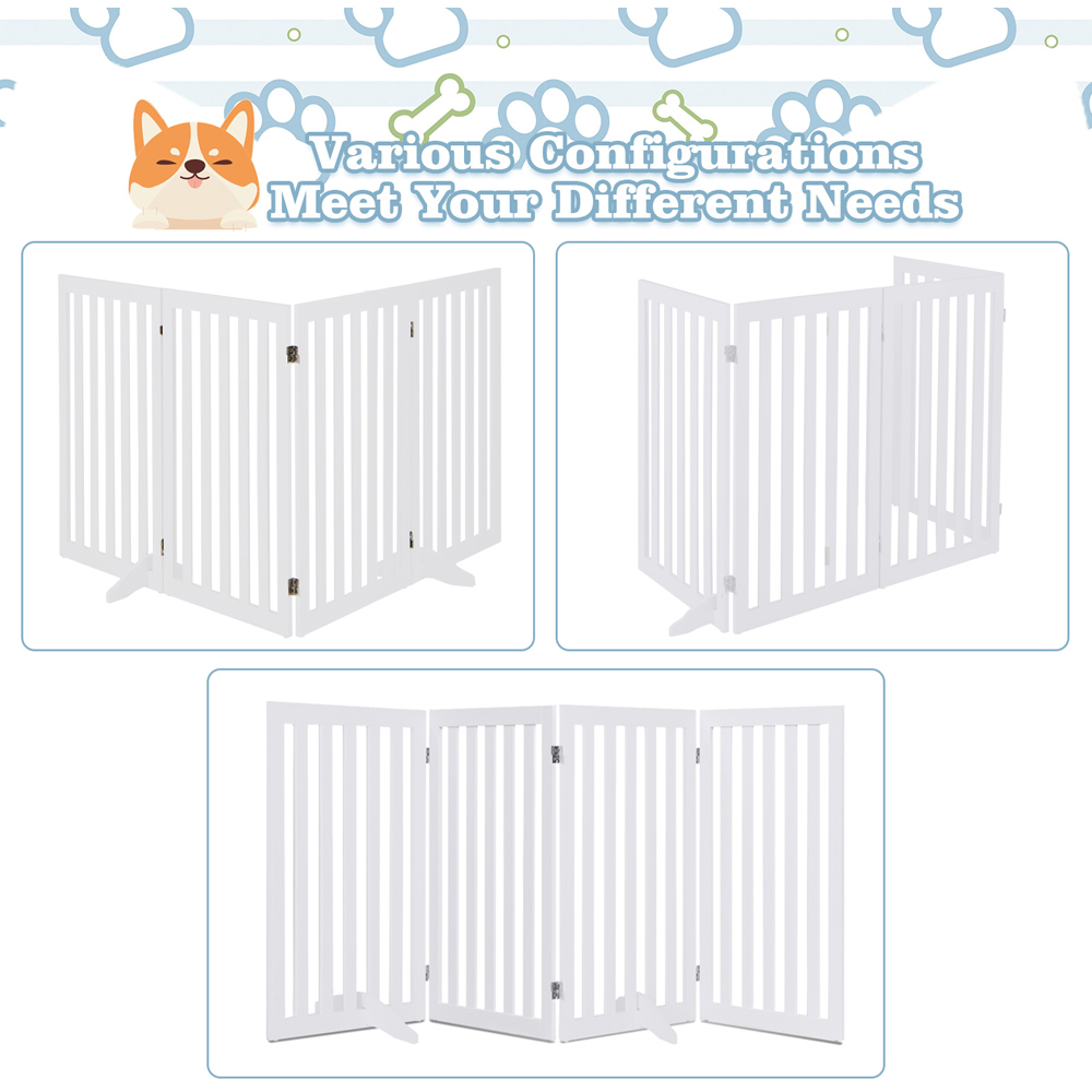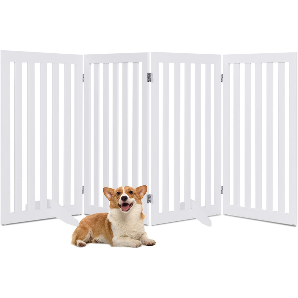 Keep your furry friends safe and your home intact with the Costway 4 Panel 89cm White Pet Safety Gate. It features six flexible hinges for versatile setup options. Whether you need to block off a doorway, staircase, or larger opening, this pet barrier adapts effortlessly to your space requirements. Crafted from high-quality MDF with a sleek white finish, it not only ensures durability but also blends seamlessly with your home decor. The barrier stands at a convenient 60cm height, allowing easy stepping over while effectively containing smaller pets. When not in use, its folding structure allows for compact storage, making it as practical as it is stylish.