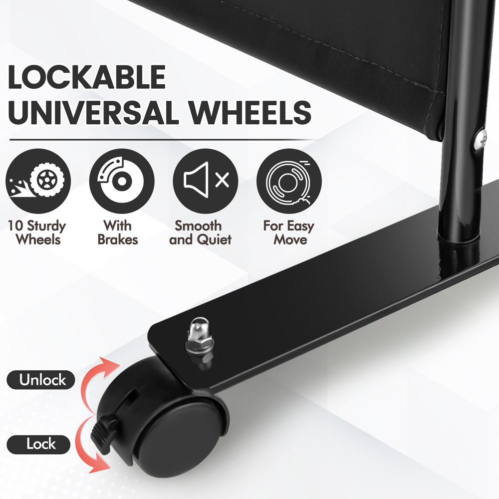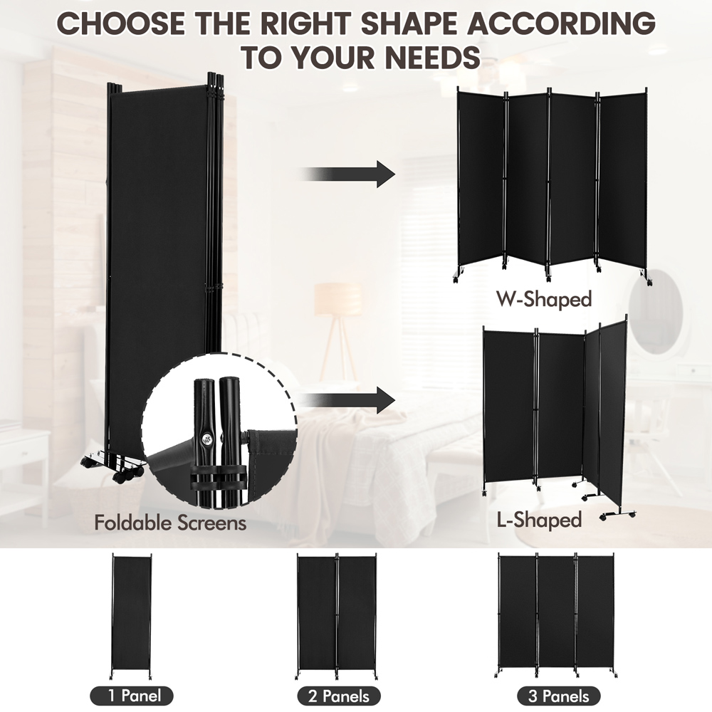 Enhance your living space with flexibility and style using the Costway 4 Panel Black Folding Room Divider with Wheels. This versatile privacy screen effortlessly combines functionality with design, featuring a sturdy metal frame and breathable, wear-resistant fabric panels. It's equipped with ten lockable universal wheels, making it incredibly easy to move and secure in place. Whether you need to create a private area in your living room or bedroom, or set up a distraction-free zone in a public space, this room divider is up to the task. Its folding design allows for multiple configurations, such as L-shaped or W-shaped, to fit your specific needs, while the large dimensions ensure ample coverage. Ideal for a variety of uses, from blocking sunlight next to a window to providing a backdrop for video conferences, this room divider is a practical addition to any setting.